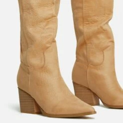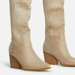 EGO Bulldoze Embroidered Detail Pointed Toe Block Heel Knee High Western Cowboy Long Boot In Khaki Nude Faux Suede