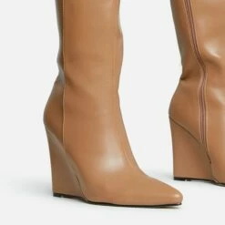 EGO Role-Play Pointed Toe Cut Out Metallic Heel Knee High Long Boot In Cream Croc Print Faux Leather
