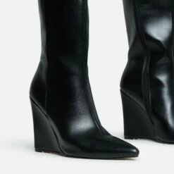 EGO Role-Play Pointed Toe Cut Out Metallic Heel Knee High Long Boot In Black Croc Print Faux Leather