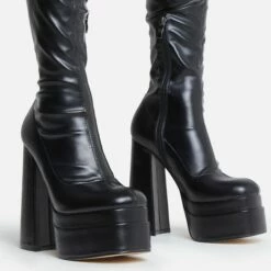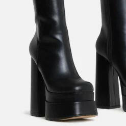 EGO Fifi Closed Square Toe Statement Platform Block Heel Ankle Biker Boot In Black Faux Leather