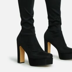 EGO No-Scrubs Lace Up Square Closed Toe Block Heel Over The Knee Thigh High Long Boot In Black Lycra