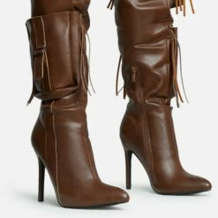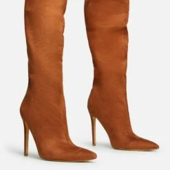 EGO Roux Pointed Toe Stiletto Heel Over The Knee Thigh High Long Slouch Boot In Tan Brown Faux Suede