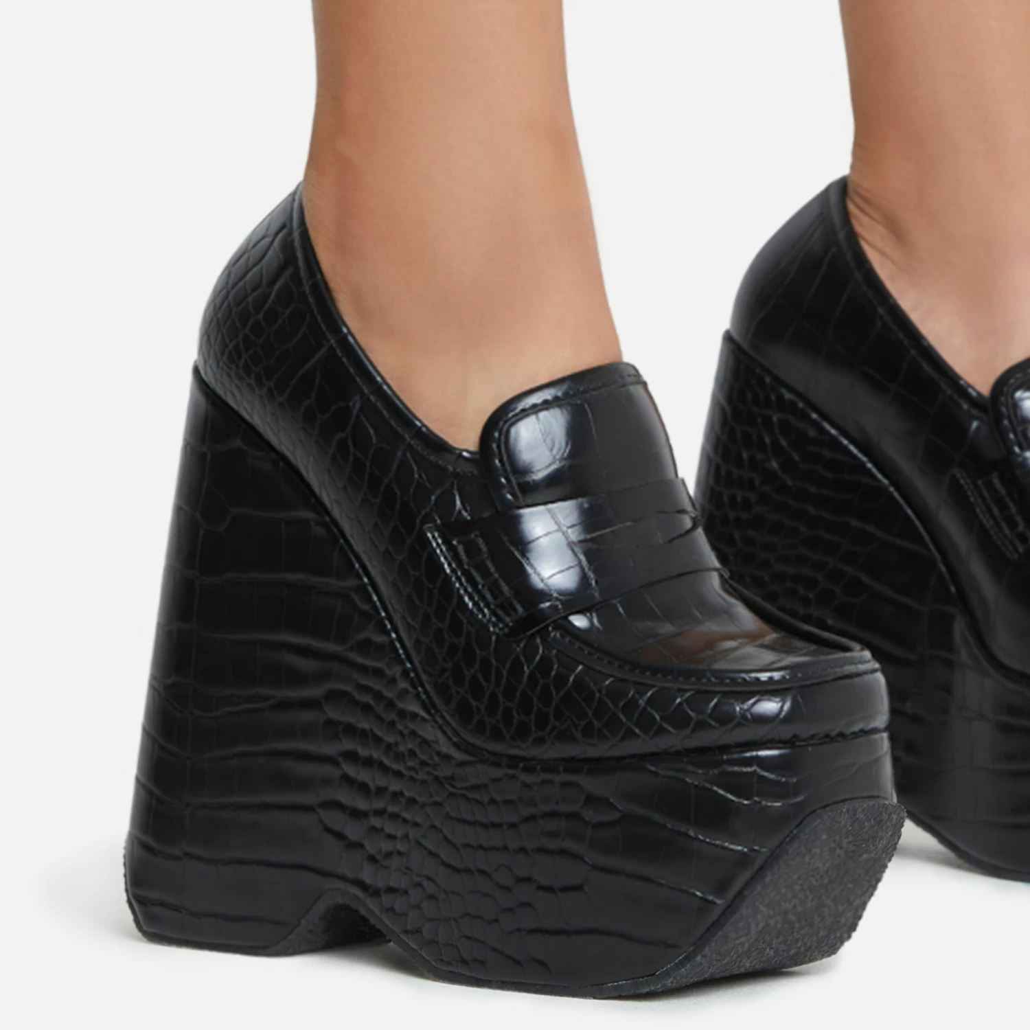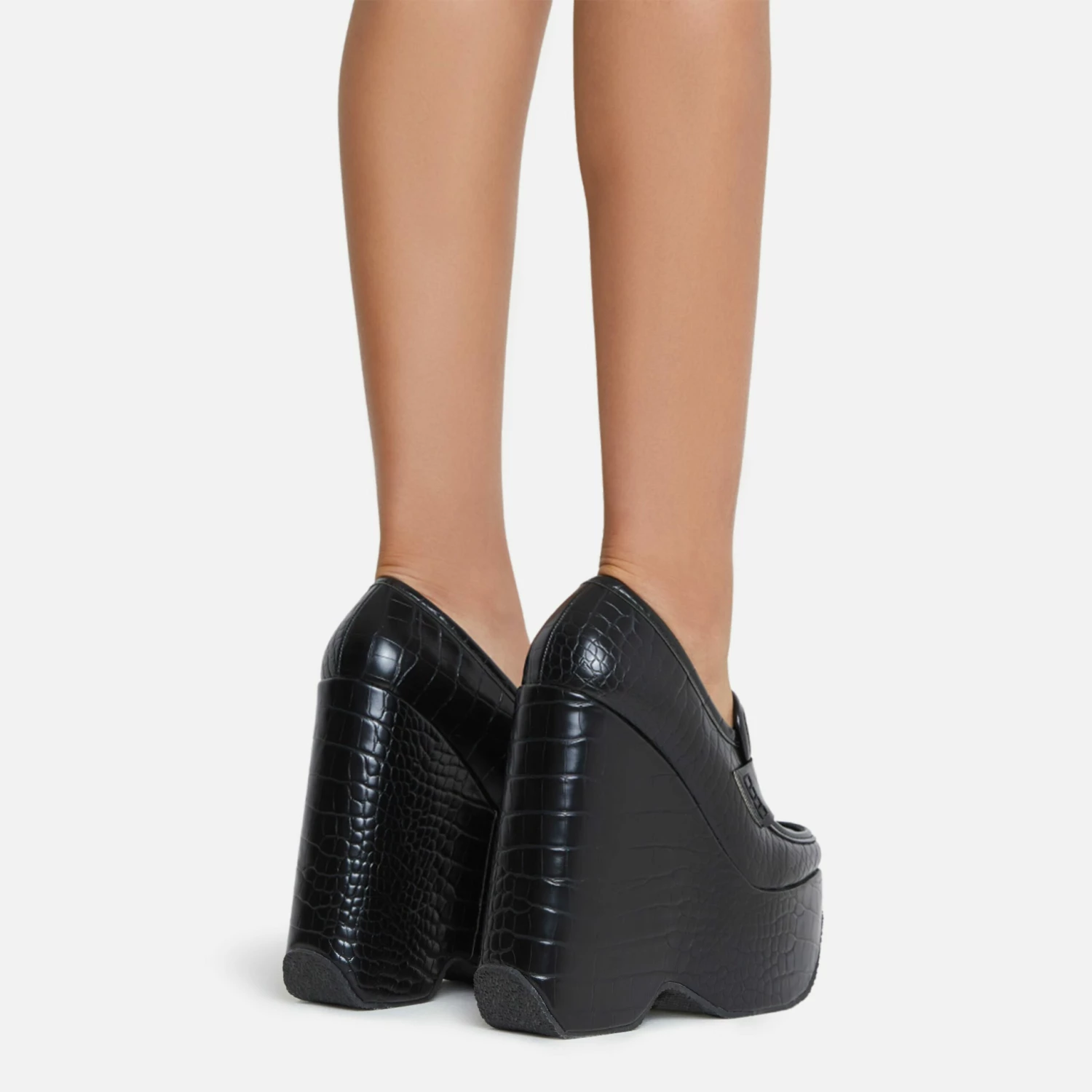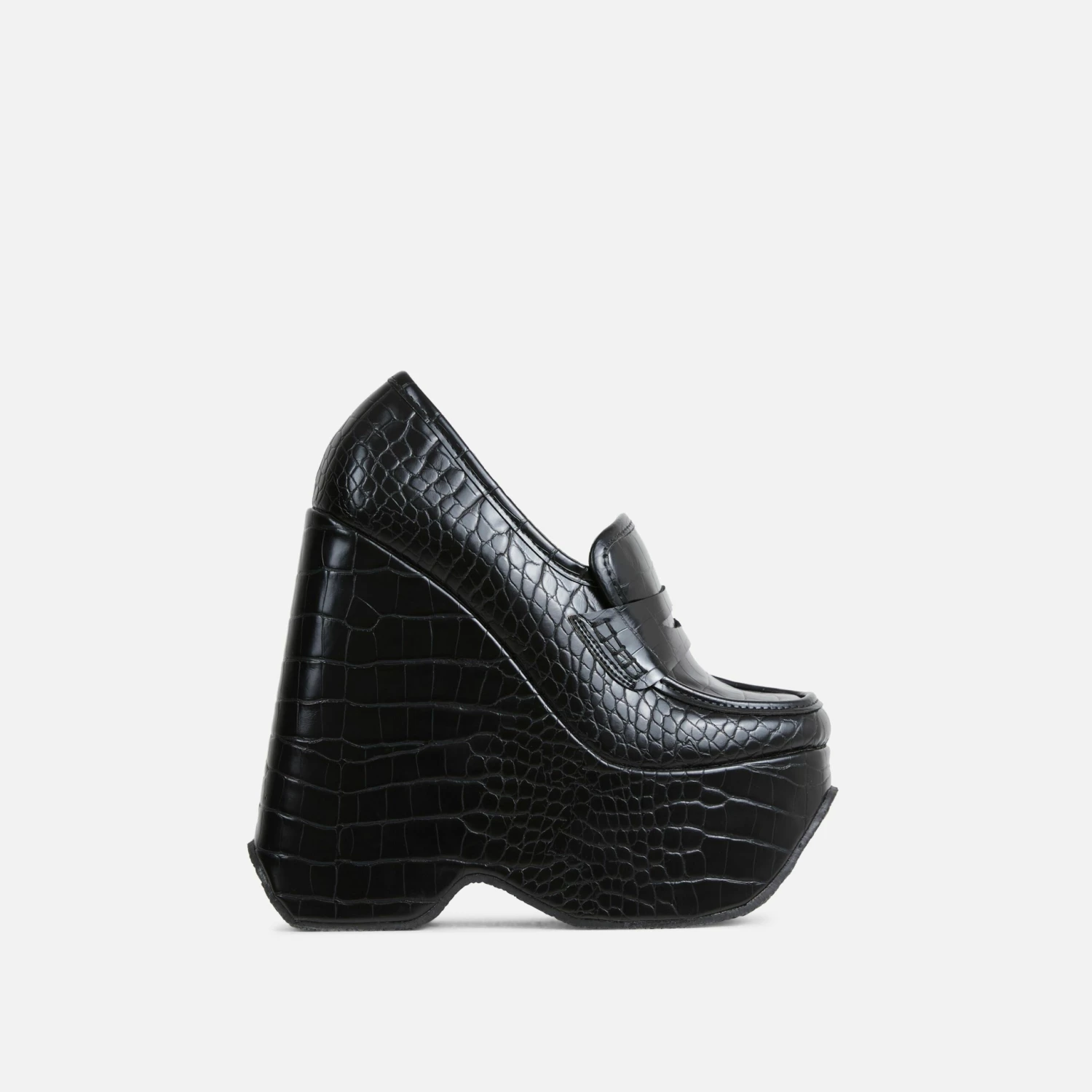 Girl, take your look from day to night in these must-have shoes. Featuring a black croc print faux leather material, with a closed square toe, a platform wedge and a loafer heel design.