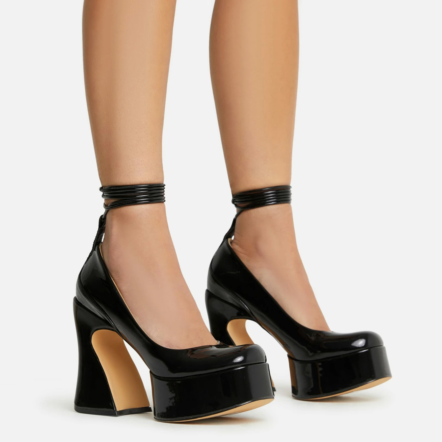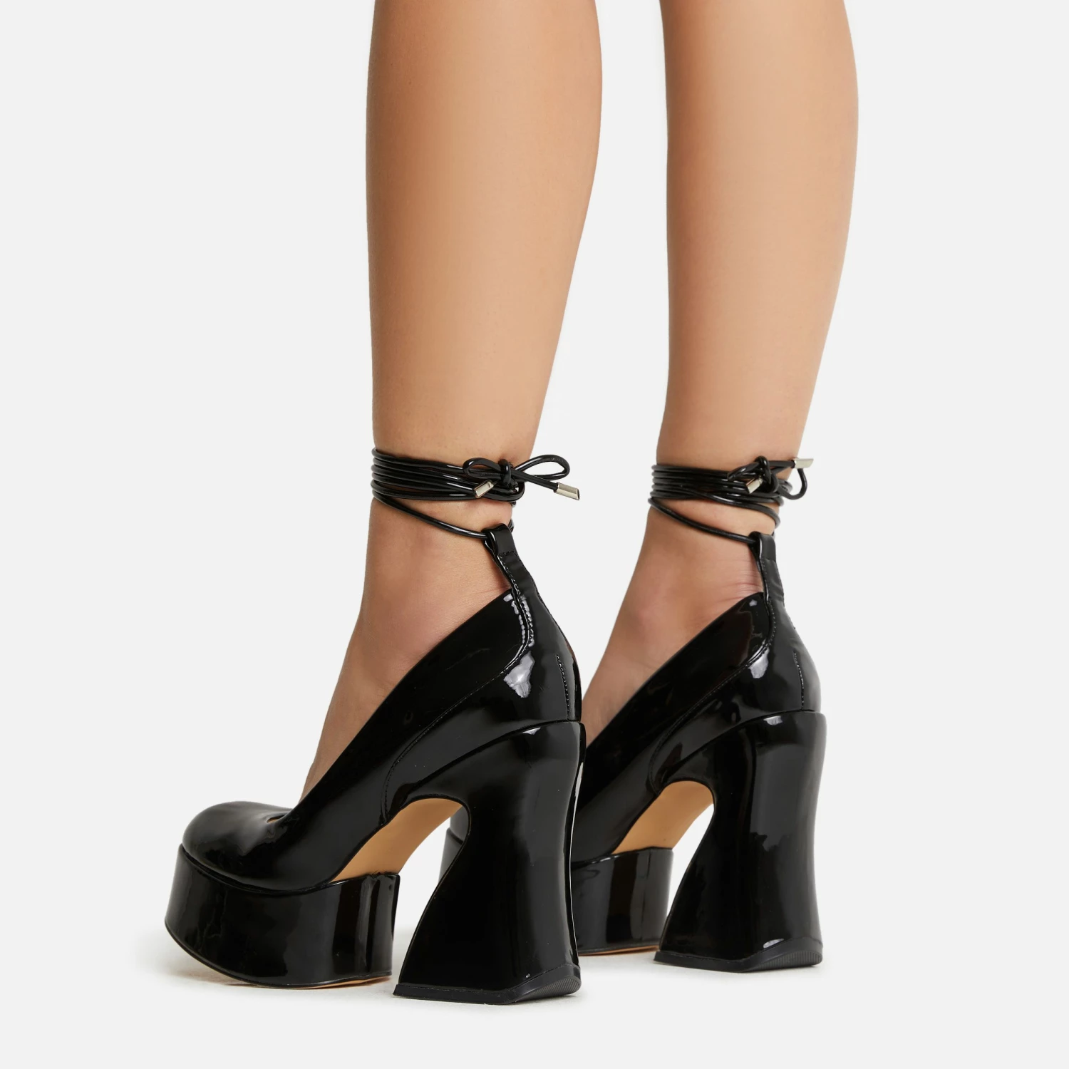 Girl, these statement heels are what your wardrobe needs. Featuring a black patent material, with a closed square toe, a statement platform block heel and a lace up finish.