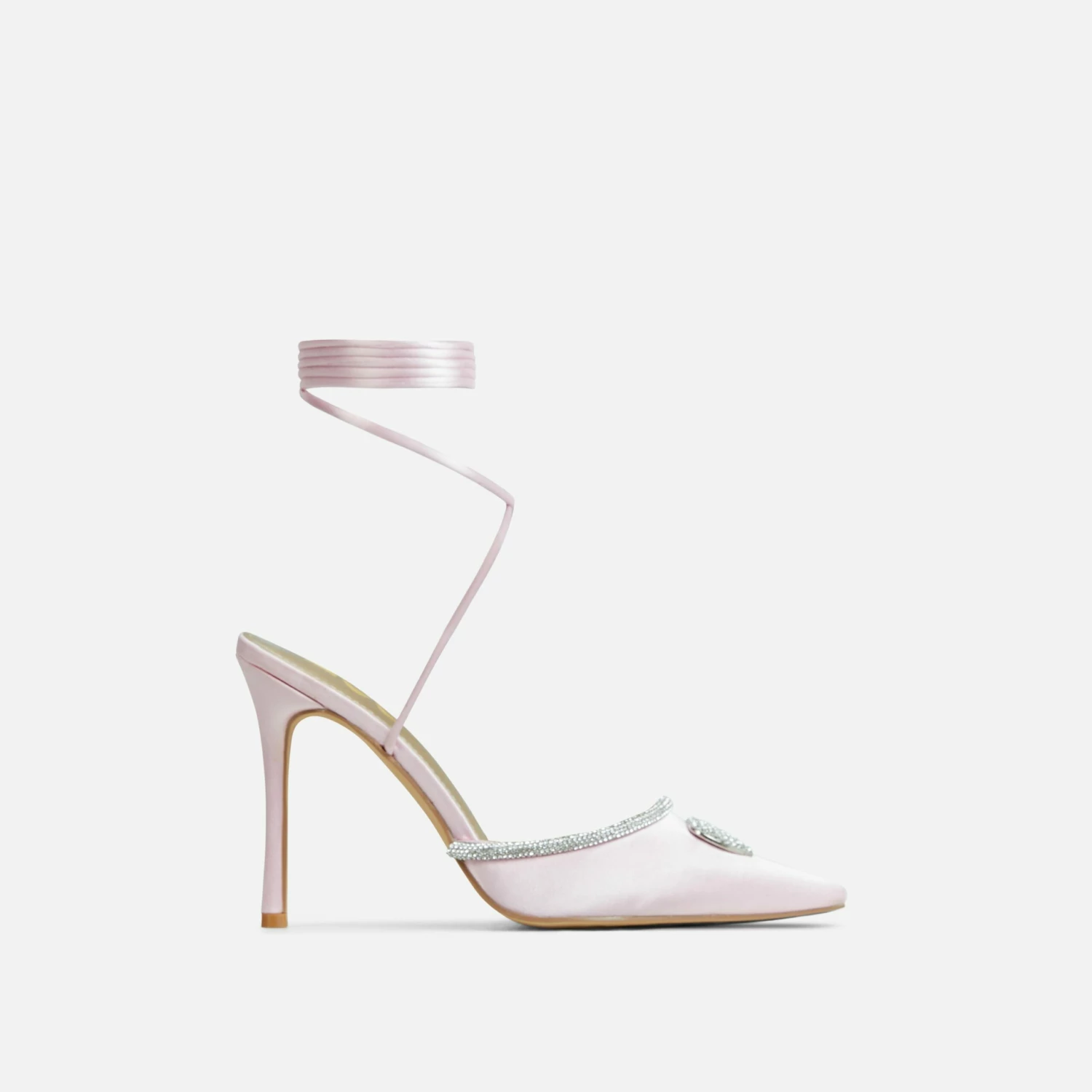 Hit refresh on your going out wardrobe doll. Featuring a pink satin material, with diamante detailing, a pointed toe, stiletto heel and a lace up finish.