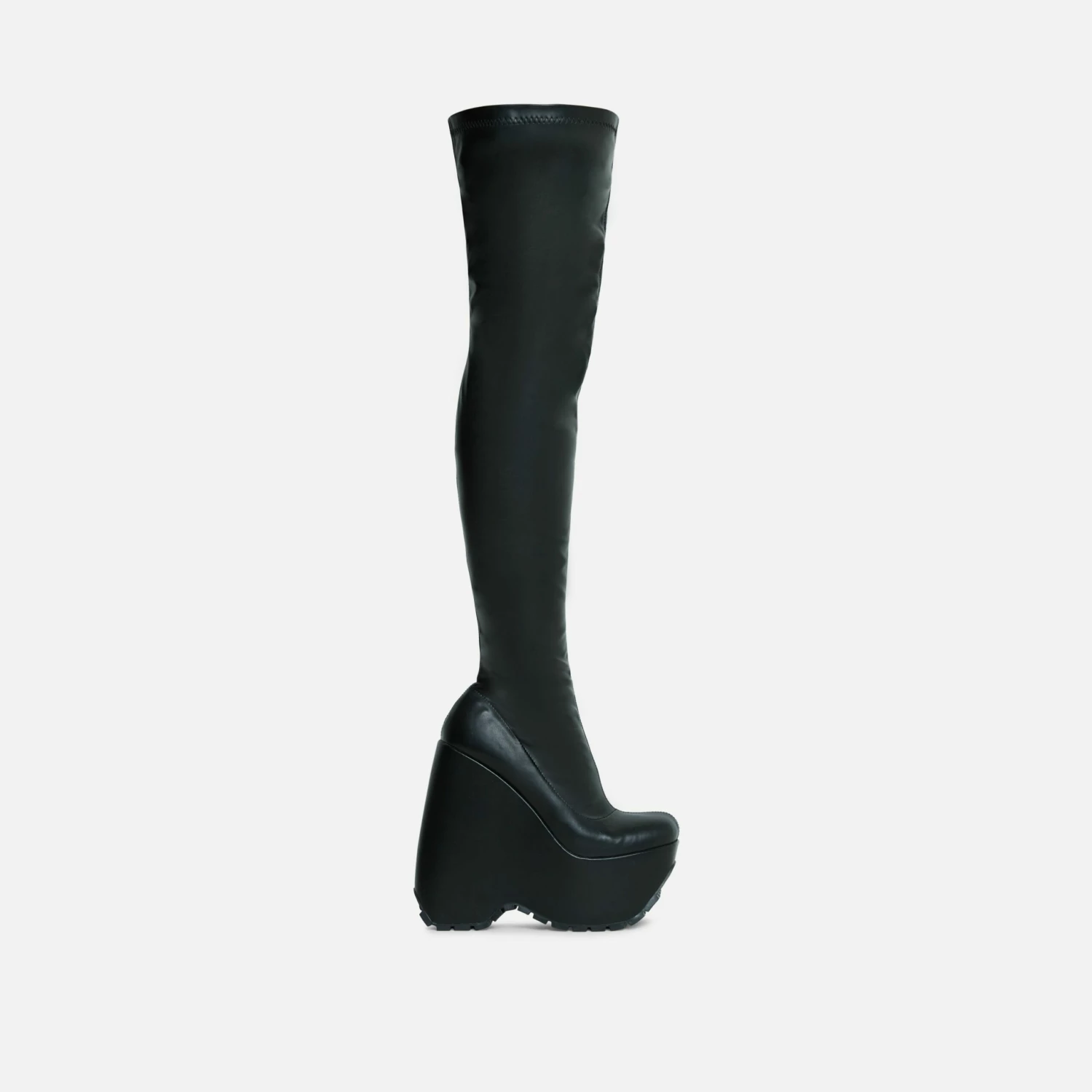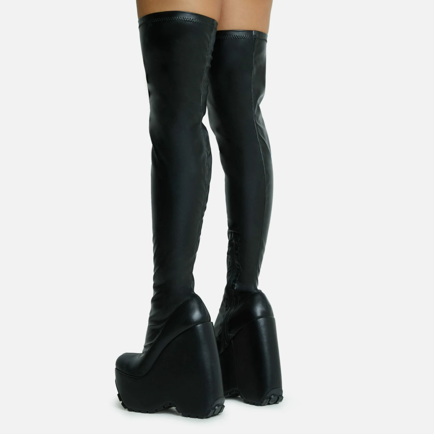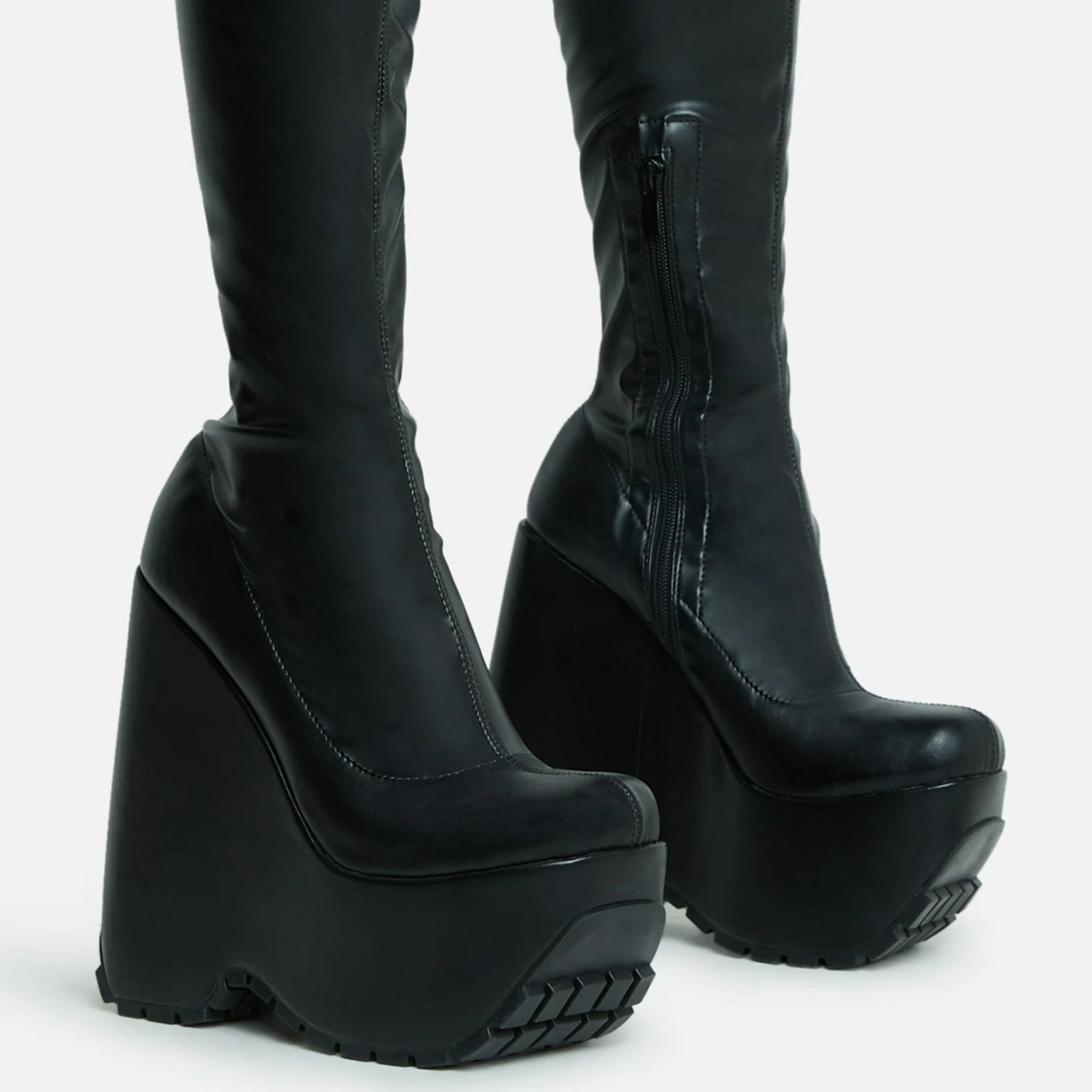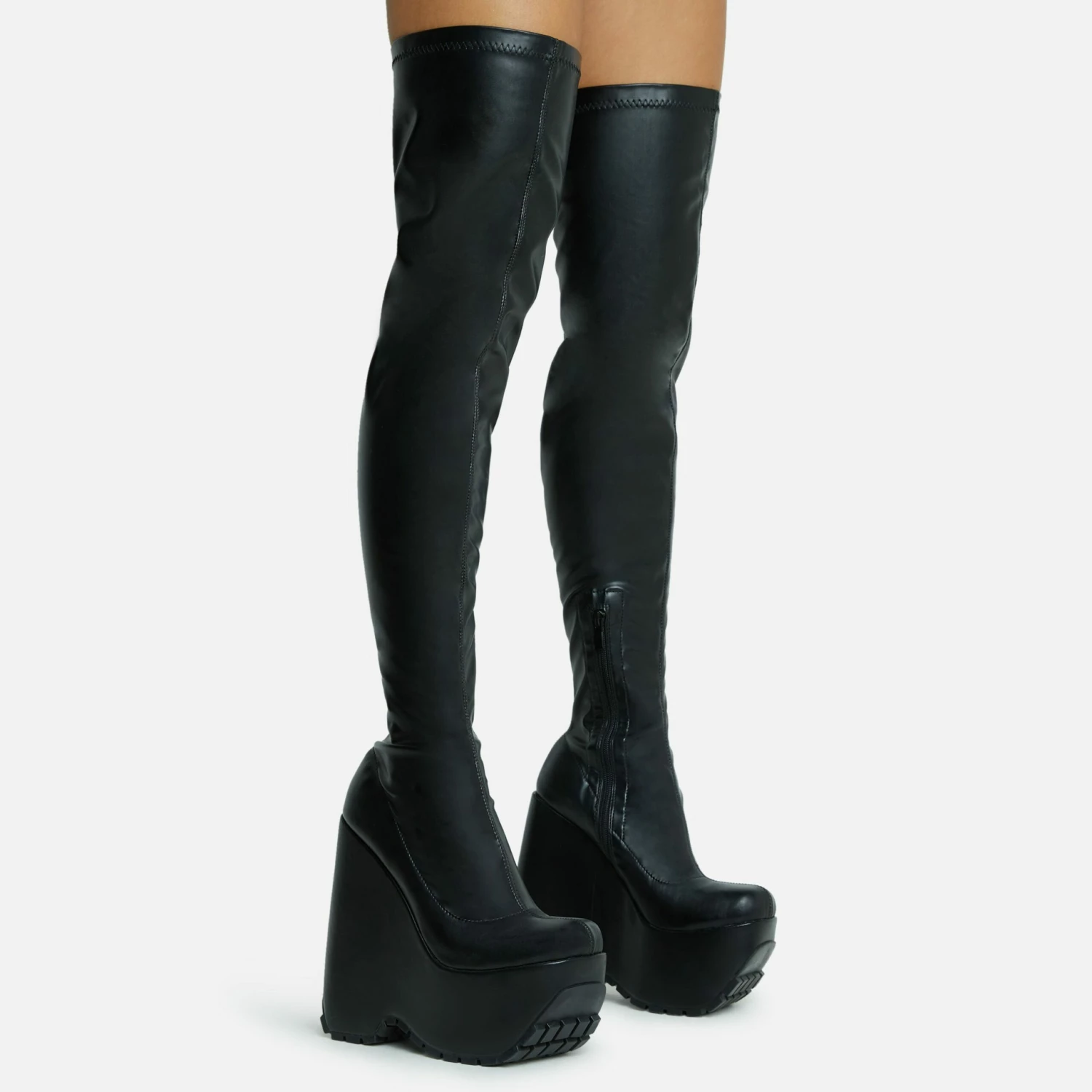 Make a bold entrance with these statement boots. Featuring a black faux leather material, with a chunky platform wedge and an over the knee thigh high length.