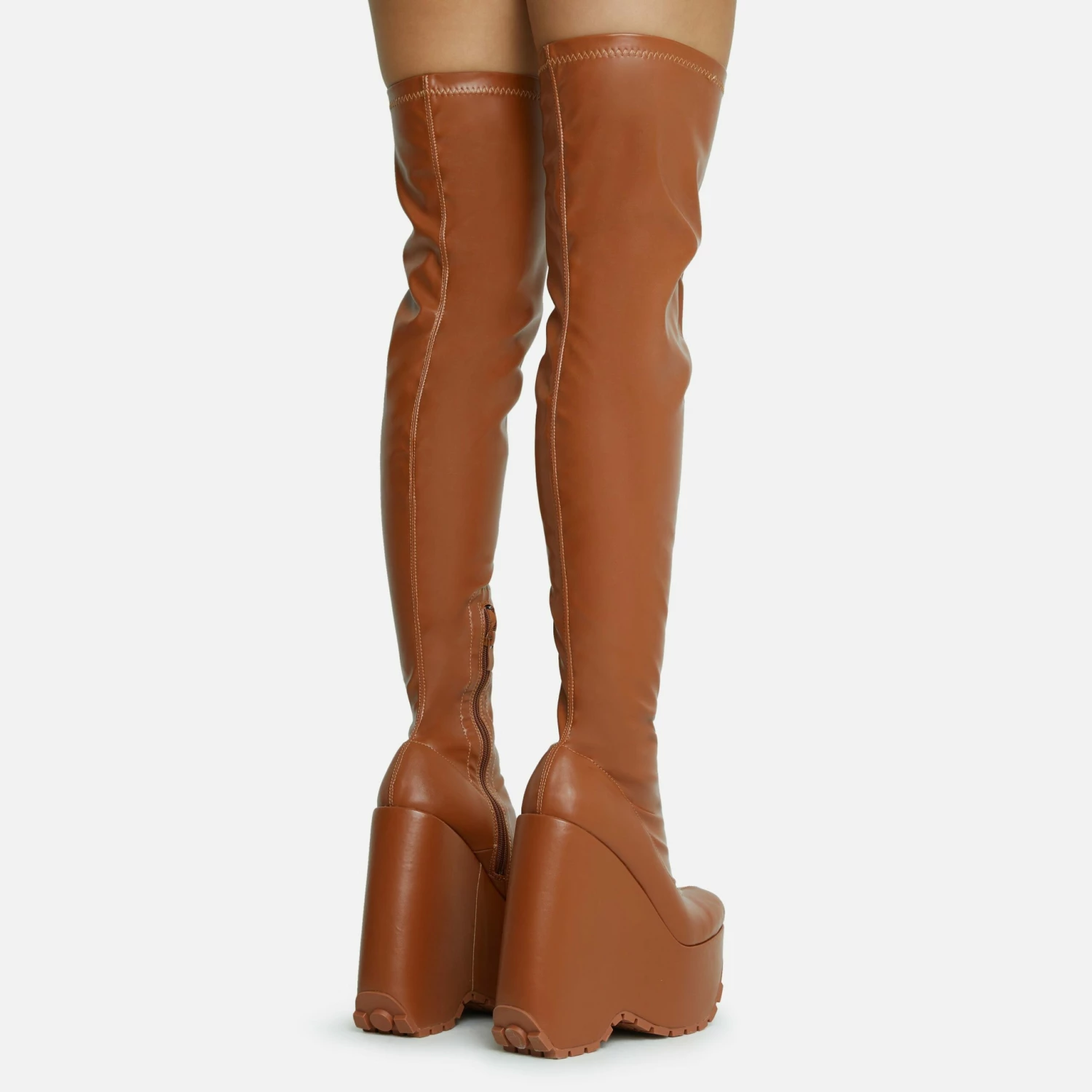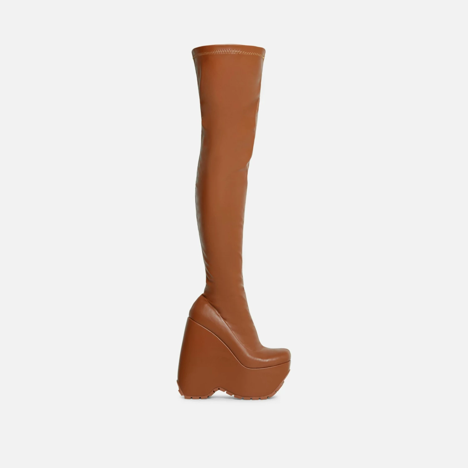 Get that ultimate A/W look doll. Featuring a tan brown faux leather material, with a chunky platform wedge and an over the knee thigh high length.