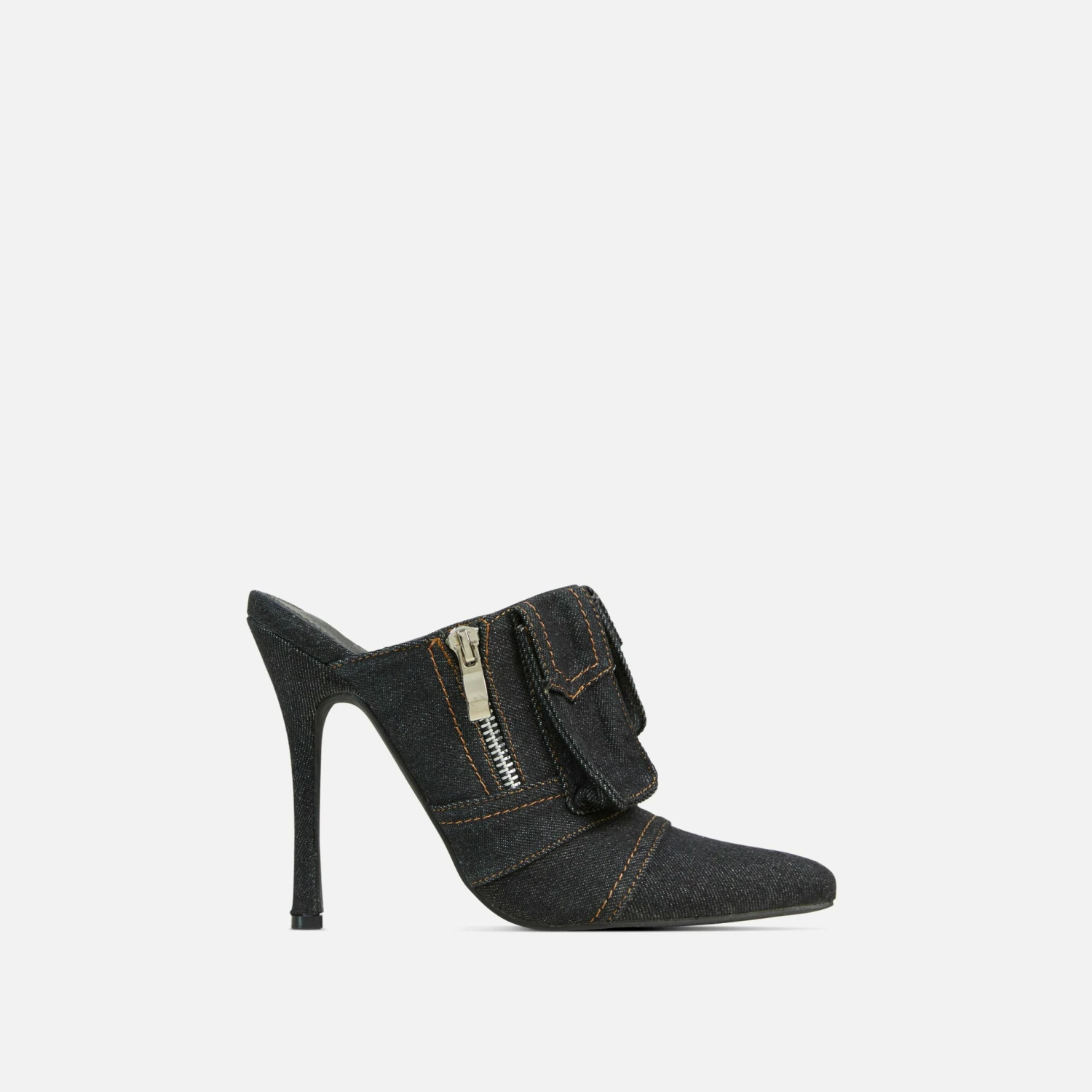 Take your look form 0-100 with these heels. Featuring a black denim material, a zip detailing, a pointed toe and a stiletto heel.