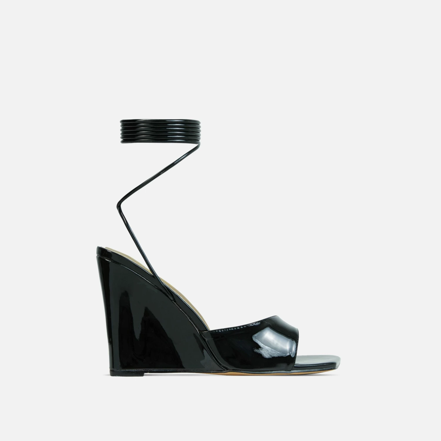 Level up your date night look with these must have heels doll. Featuring a black patent material, with a square peep toe, a wedge heel and a lace up finish.