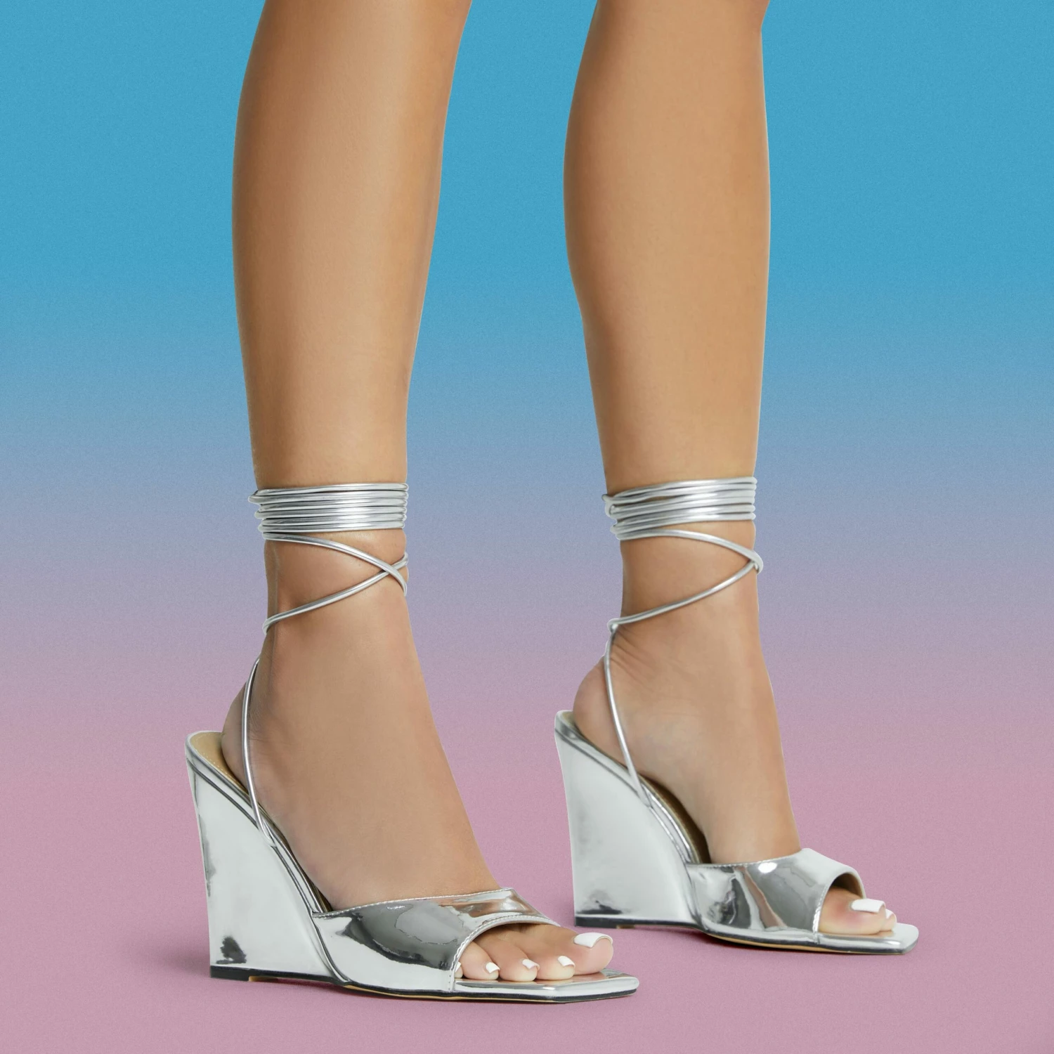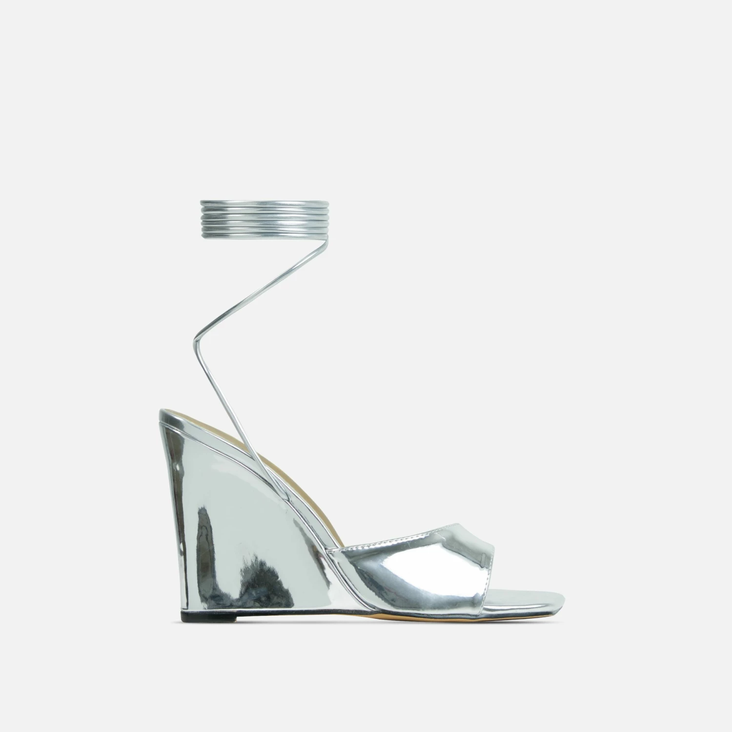 Your weekend look just went from 0-100 with these heels. Featuring a silver metallic faux leather material, with a square peep toe, a wedge heel and a lace up finish.