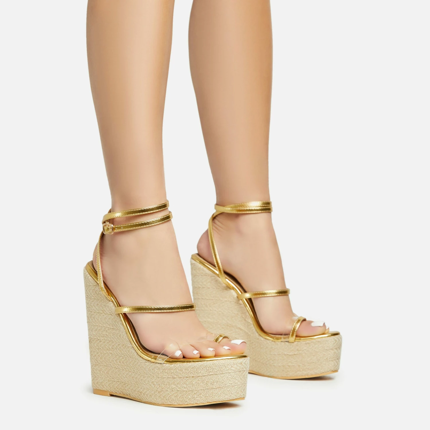Get yourself noticed in these to die for heels. Featuring a gold faux leather material, with clear perspex strap detailing and a woven wedge heel.