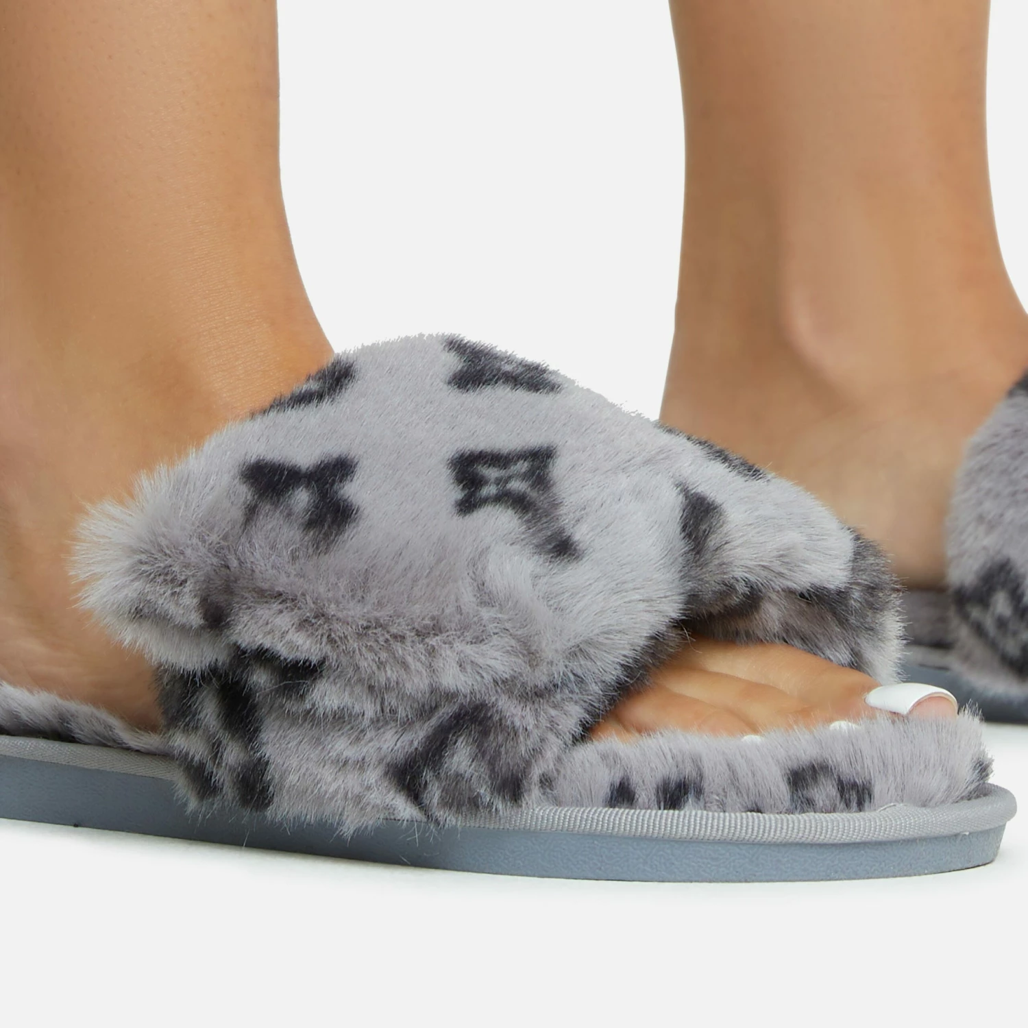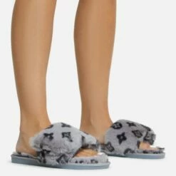 Give your off-duty at home look an update. Featuring a grey printed faux fur material, with a velcro strap and a flat slipper design.