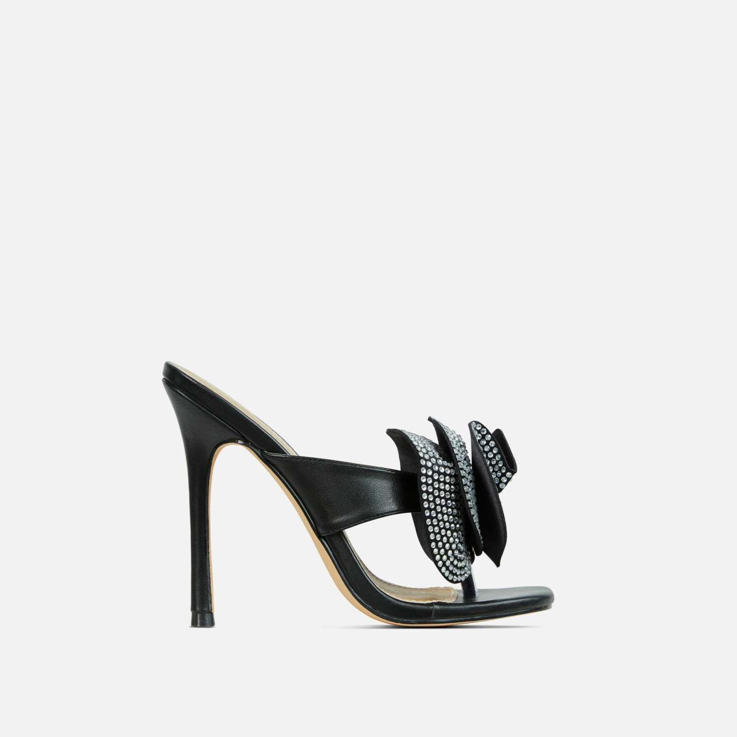 Steal the stares with these mules doll. Featuring a black faux leather material, an oversized diamante rose detail, a thong strap and a stiletto heel.
