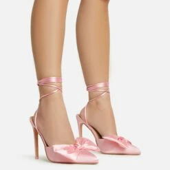 Add a feminine touch to your evening look. Featuring a pink satin material, with bow detailing, a pointed toe, stiletto heel and a lace up finish.