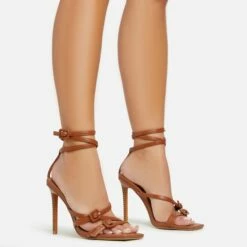 Finish off your OOTD with these heels doll. Featuring a tan faux leather material, a double buckle strap detail, a square toe and a stiletto heel.