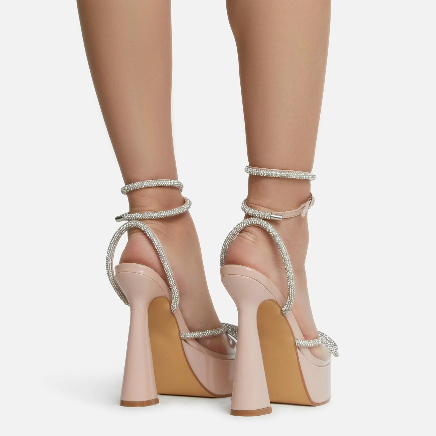 Got an important occasion on the cards? We’ve got your shoes covered. Featuring a nude patent material, with diamante bow detailing, a perspex pointed toe, platform sole and a flared block heel.