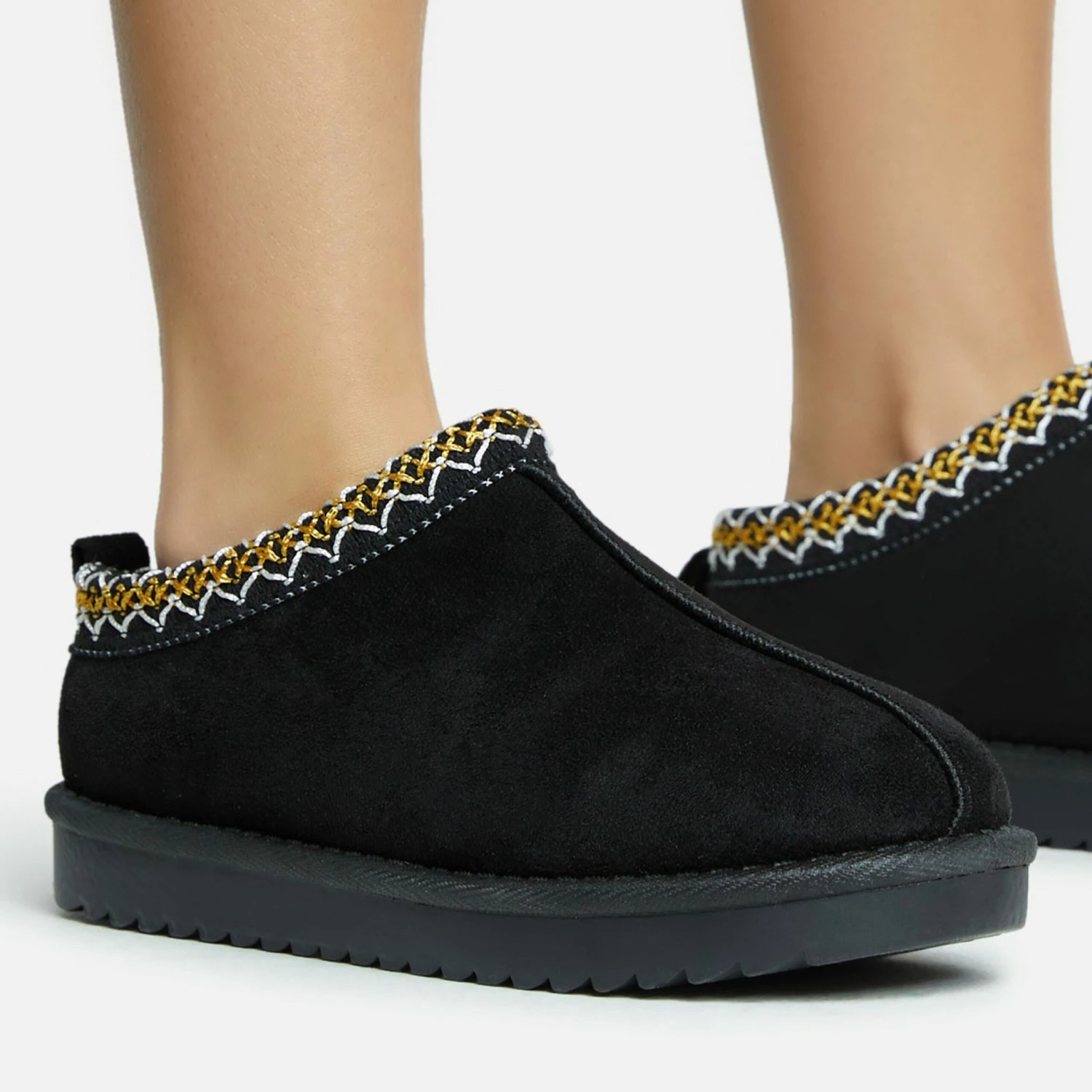 Give your off-duty look the update it deserves. Featuring a black faux suede material, with white aztec trim detailing, a closed toe and a slip on slipper design.