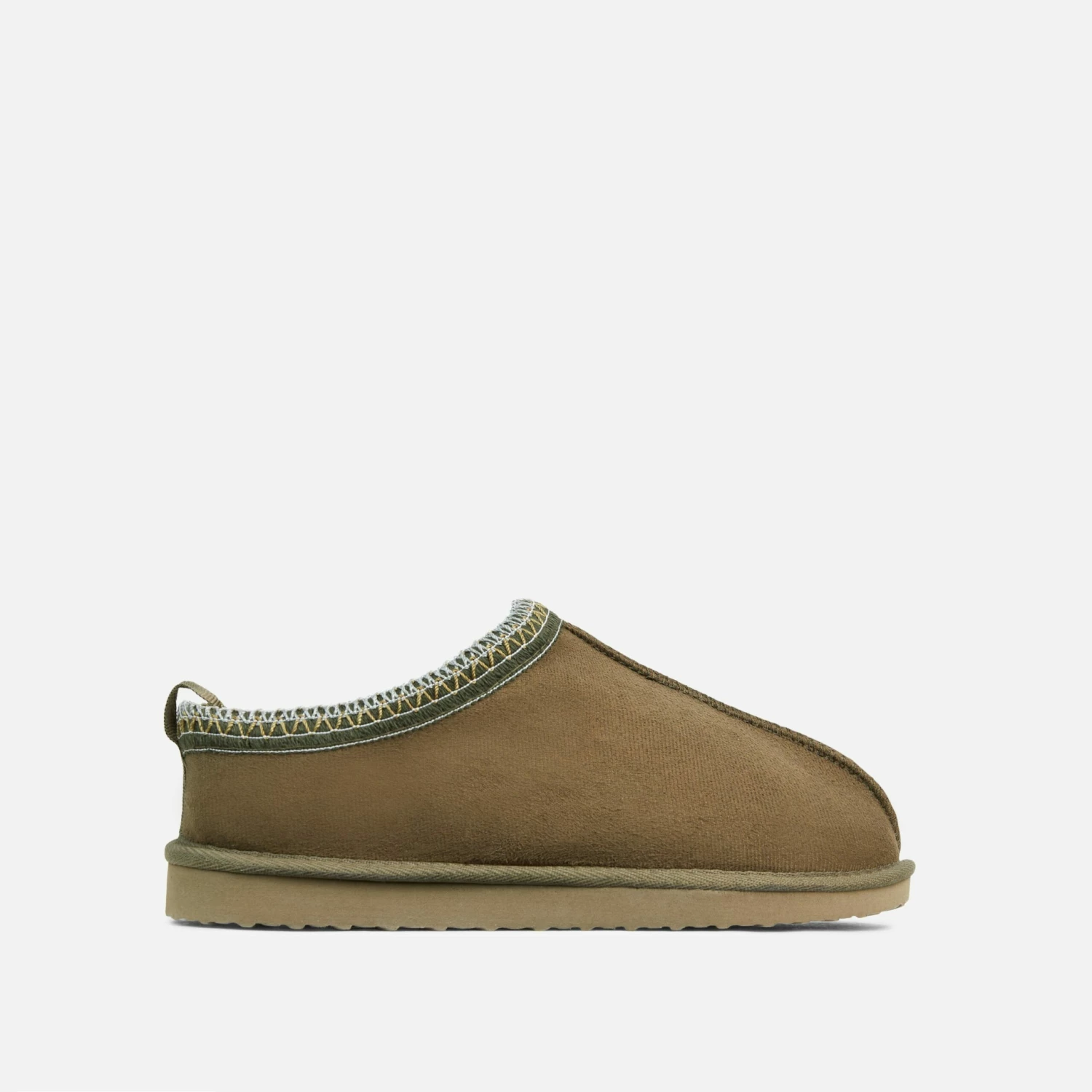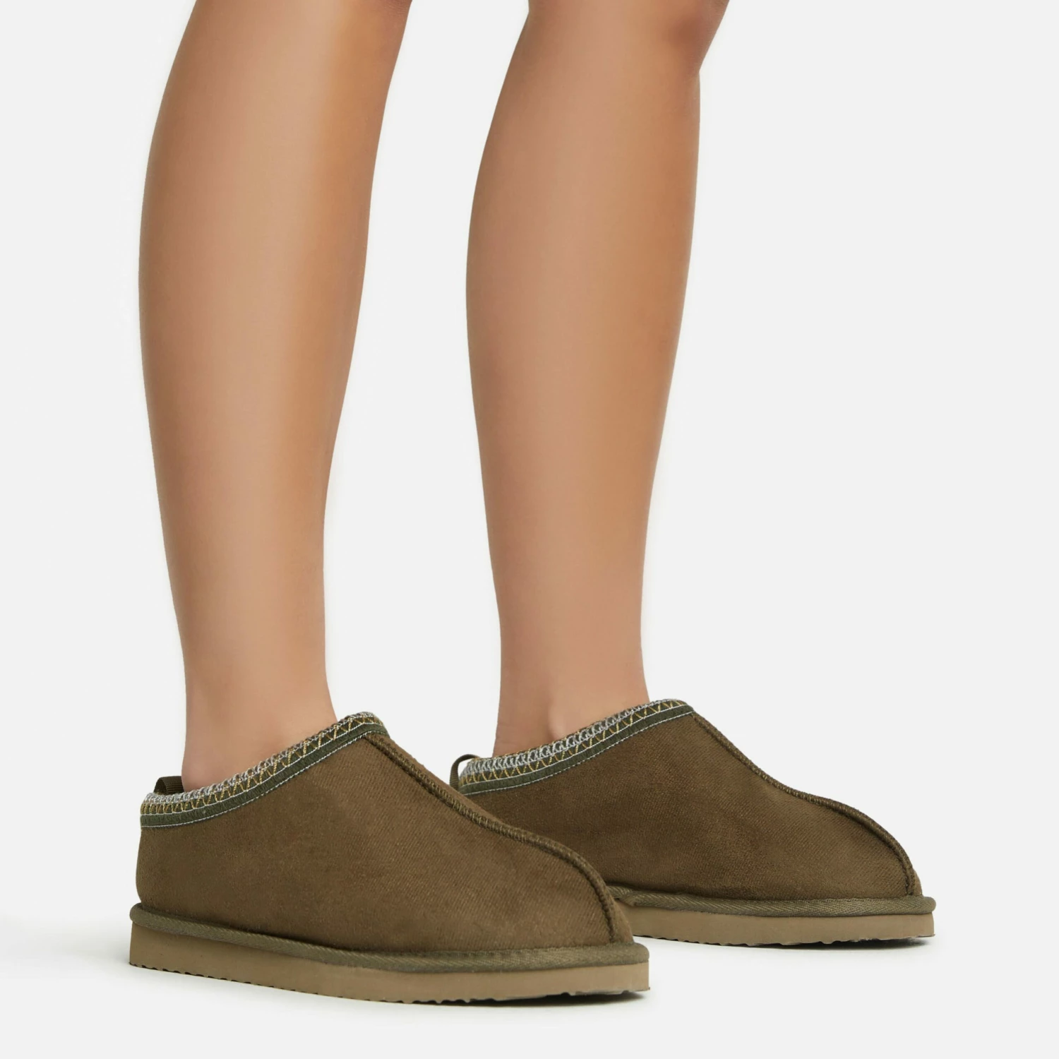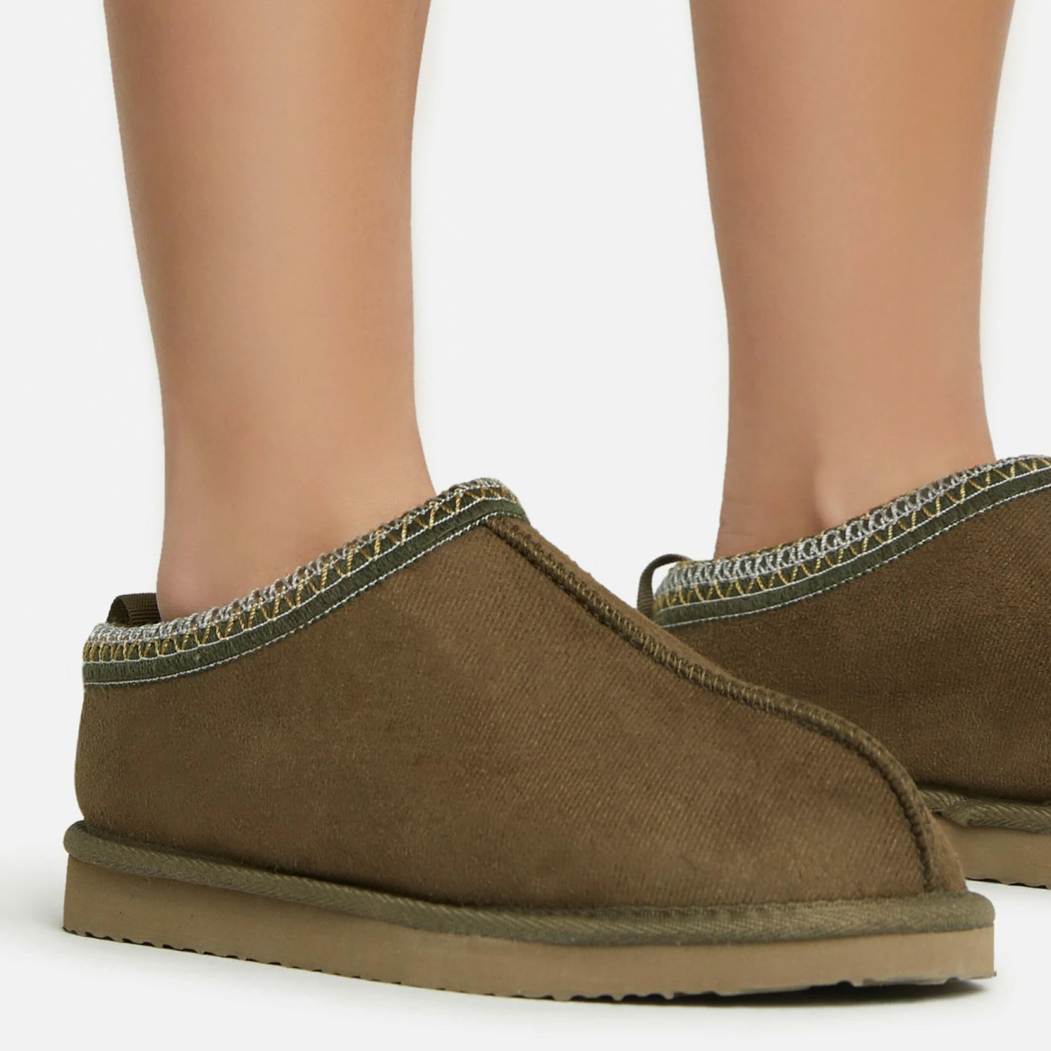 Our best selling slippers just had a major colour update. Featuring a green faux suede material, with aztec detailing, faux fur lining and a slip on slipper design.