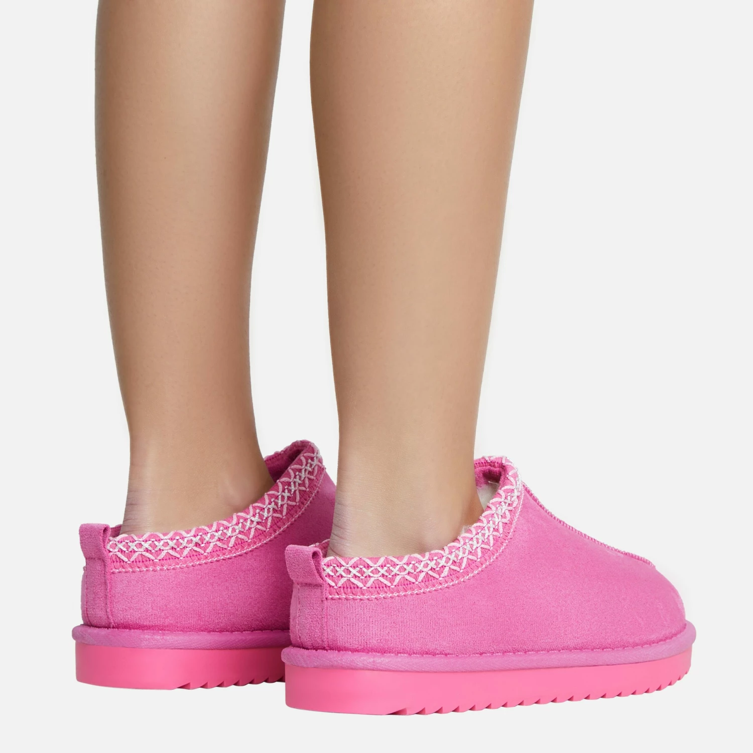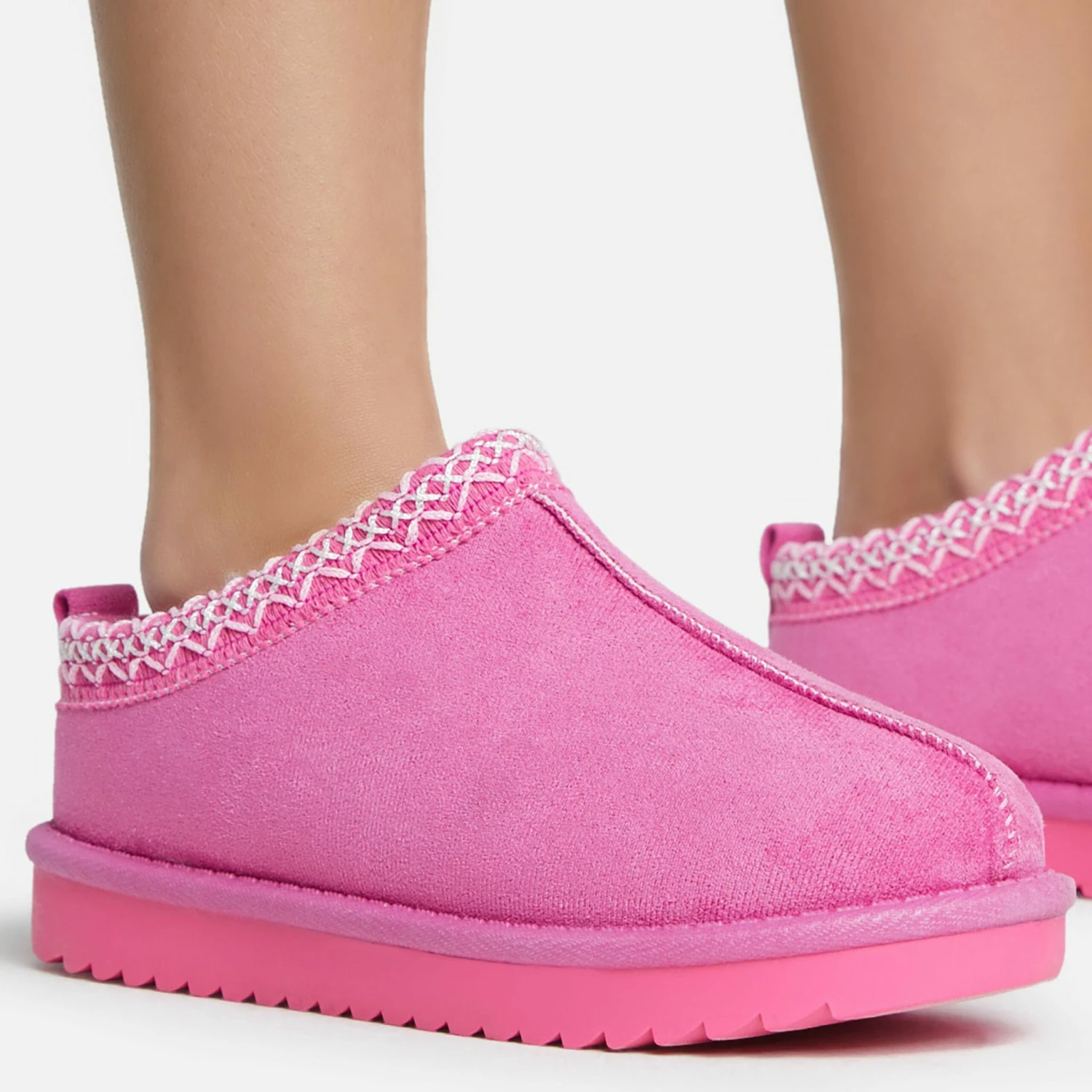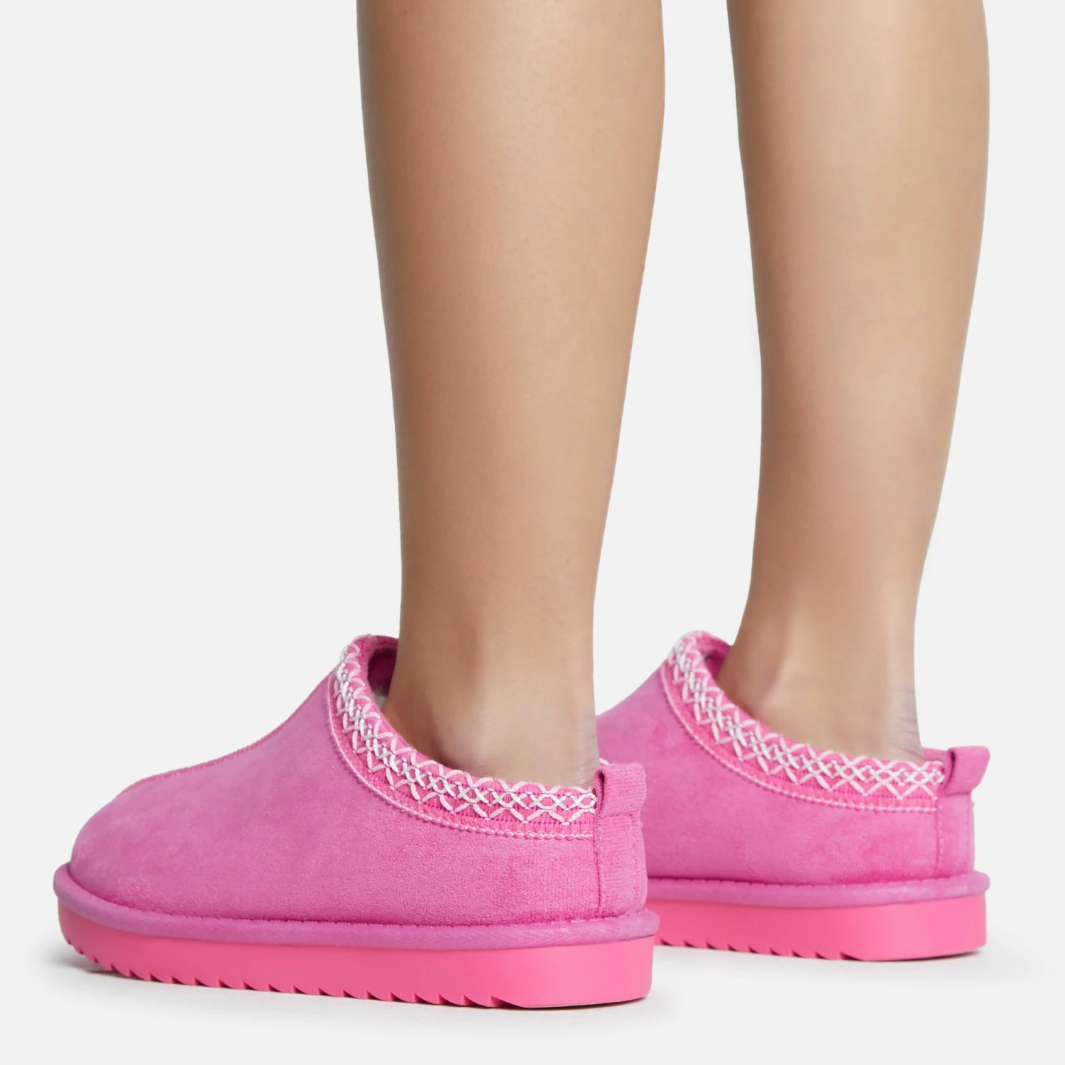 Complete your lounge at home look with these slippers. Featuring a pink faux suede material, with aztec detailing, faux fur lining and a slipper design.