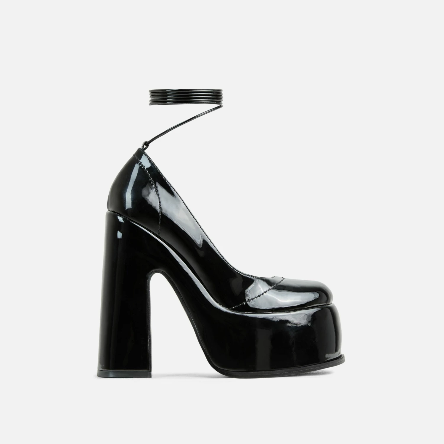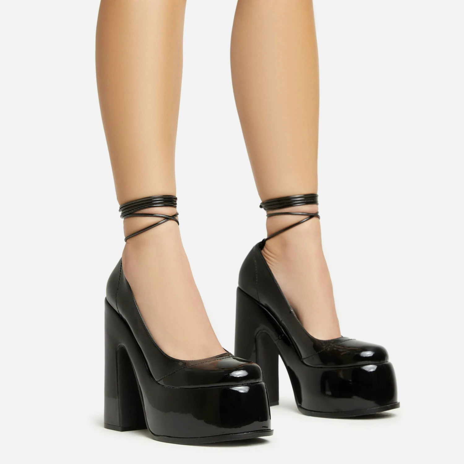 These heels are sure made for walking girl. Featuring a black patent material, a closed toe, lace-up design and a platform block heel.