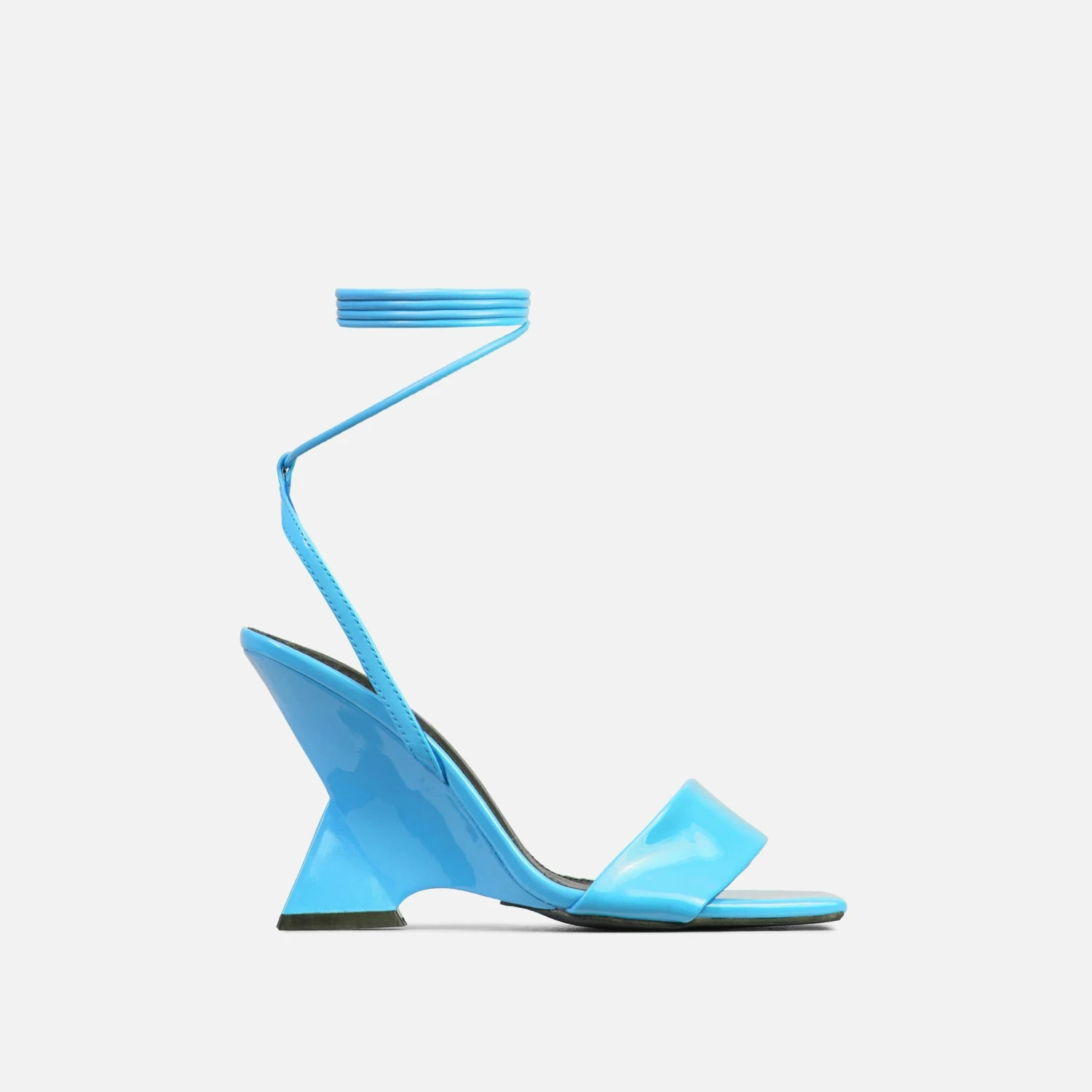 Girl, the weekend is here and we have your shoedrobe covered. Featuring a blue patent material, with a square toe, a cut out wedge heel and a lace up finish.