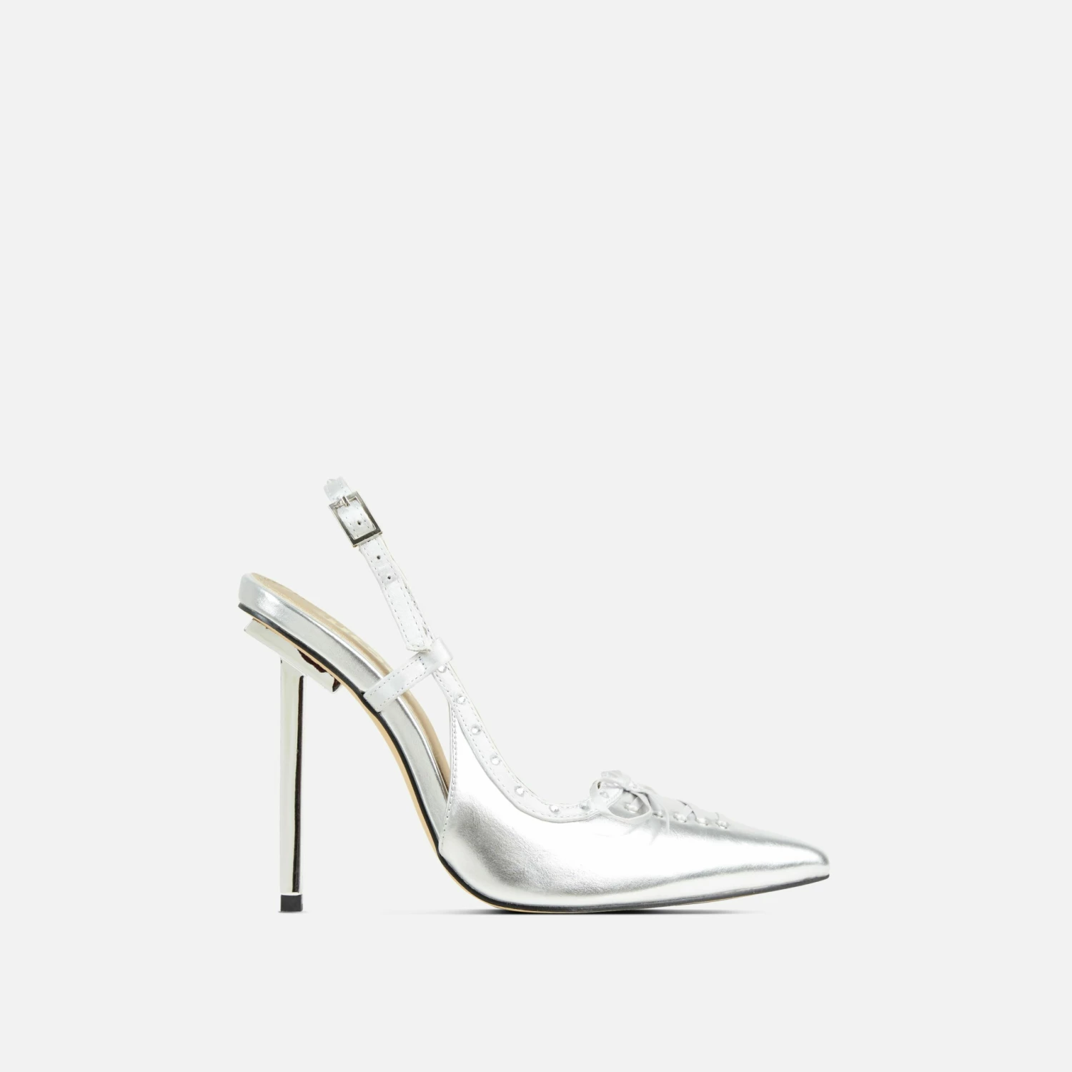 Level up your evening look with these new season heels. Featuring a silver faux leather material, with lace up bow and diamante stud detailing, a pointed toe, metallic stiletto heel and a slingback design.