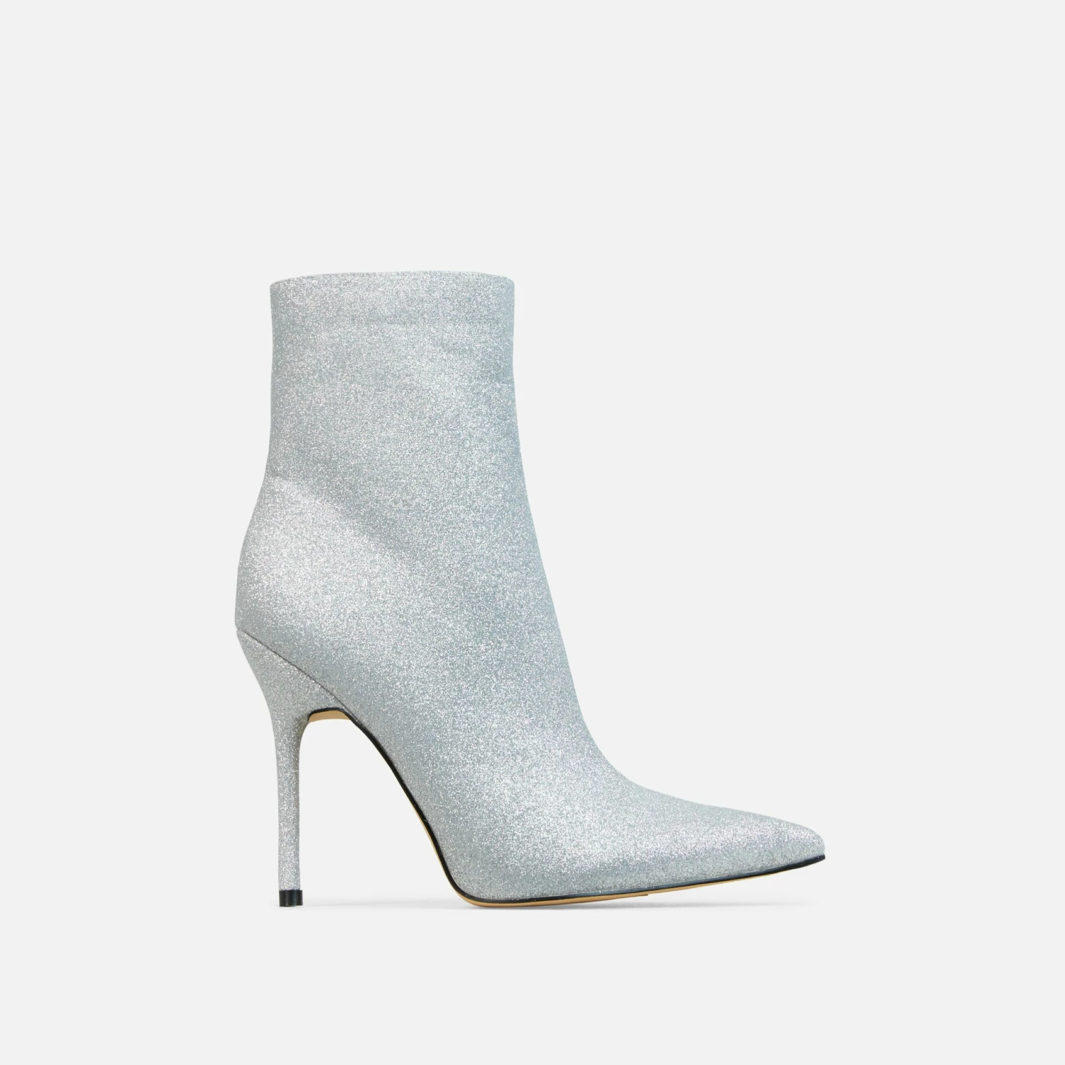 Make a bold entrance in these statement heels doll. Featuring a silver glitter material, with a pointed toe, a stiletto heel and an ankle length.