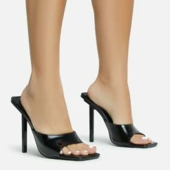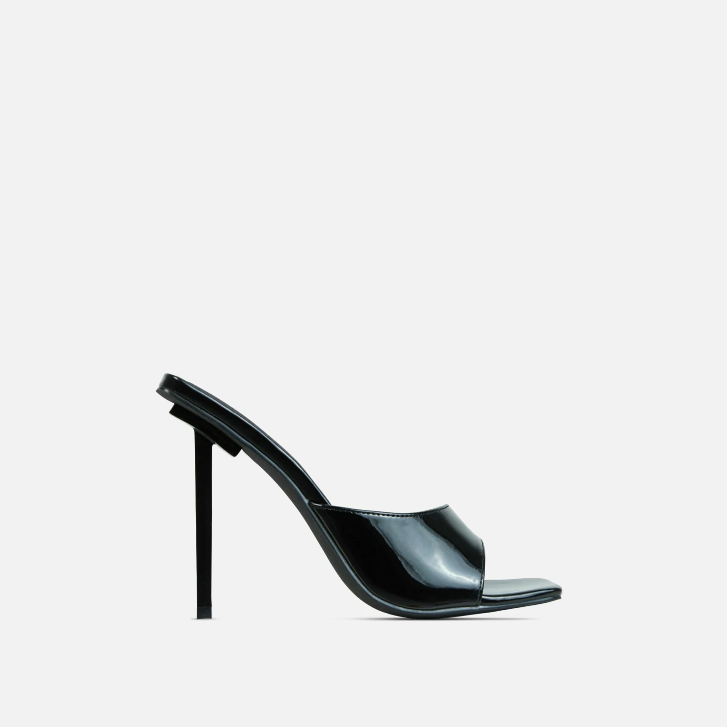 Take your look from day to night with these classic heels. Featuring a black patent material, with a square peep toe, a stiletto heel and a slip on mule design.
