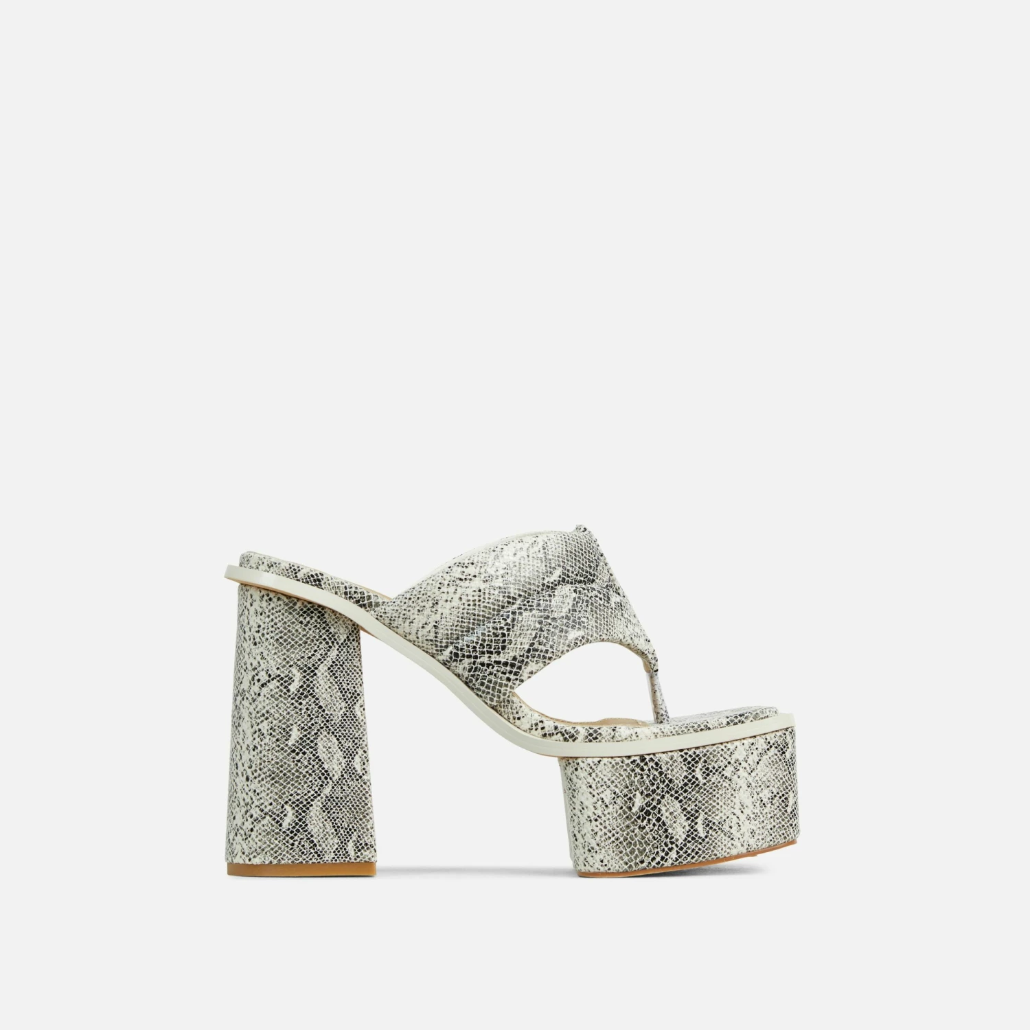 Date night this weekend? We’ve got you covered with these mules. Featuring a beige faux leather material, a padded thong strap, a square toe and a block heel.