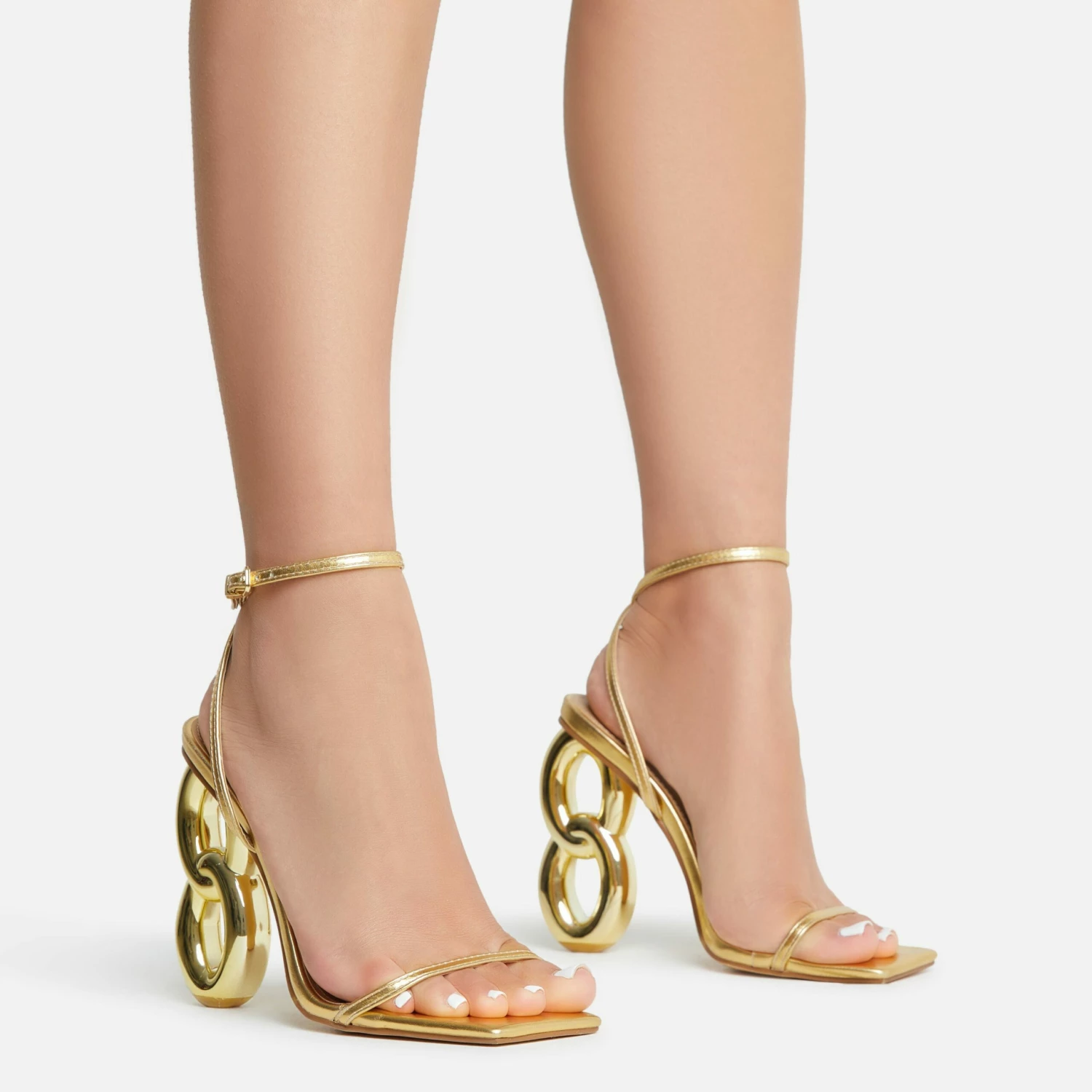 Girl, make an entrance with these gorg heels. Featuring a gold faux leather material, with an ankle strap and a gold chain heel.