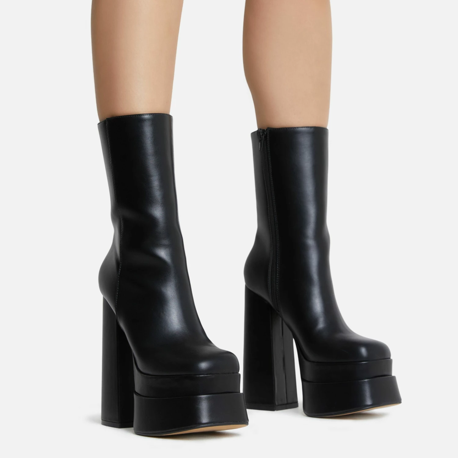 Make a bold statement in this seasons must-have boots. Featuring a black faux leather material, with a closed square toe, a statement platform block heel and an ankle biker boot design.