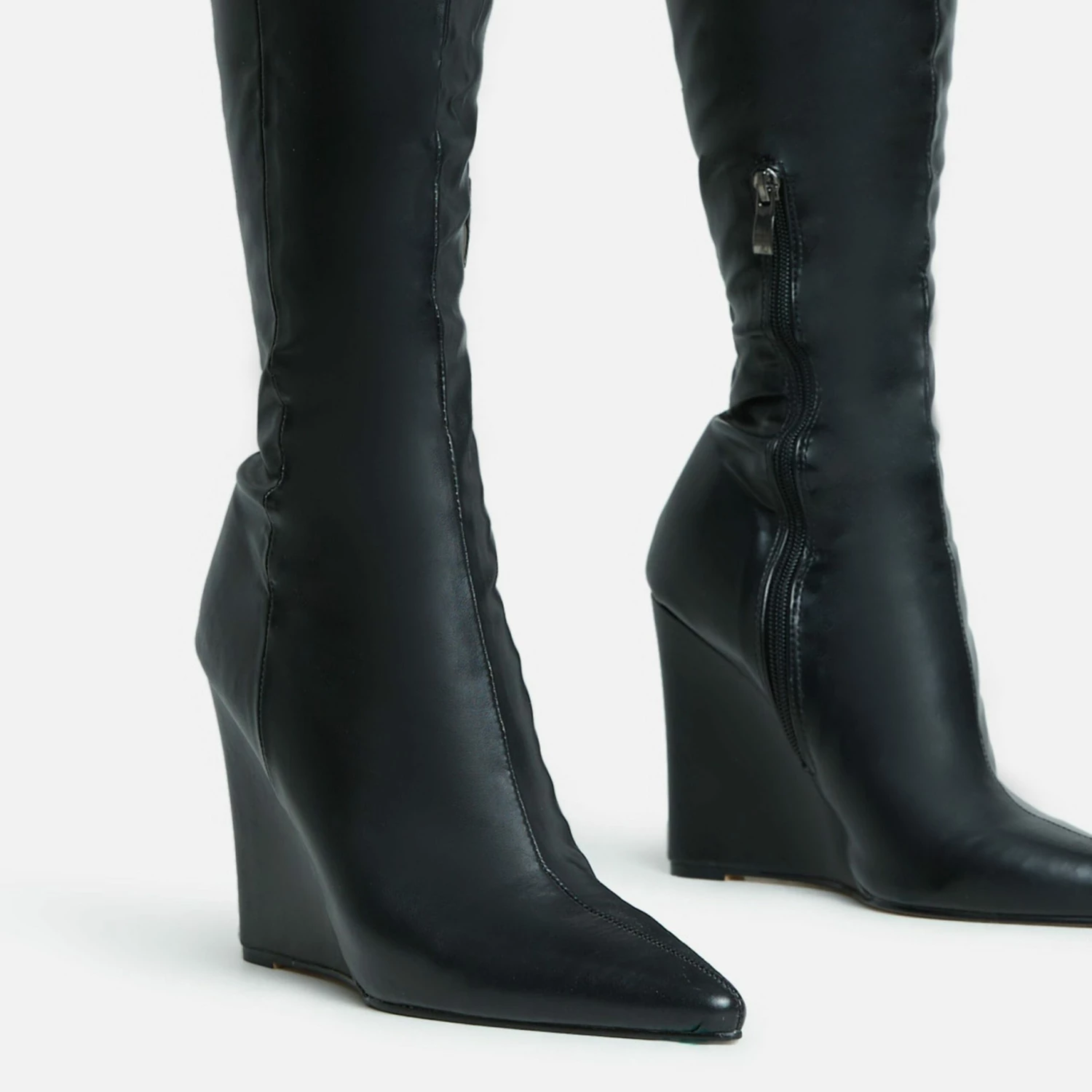 Girl, have all eyes on you in brand new EGO. Featuring a black faux leather material, with a pointed toe, a wedge heel and an over the knee thigh high design.