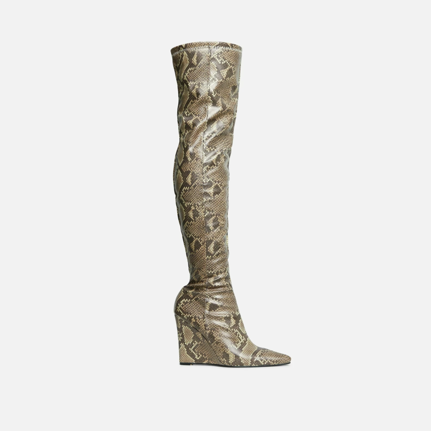 Work some prints into your outfit with these boots doll. Featuring a snake print faux leather material, a pointed toe, a wedge heel and a thigh high length.