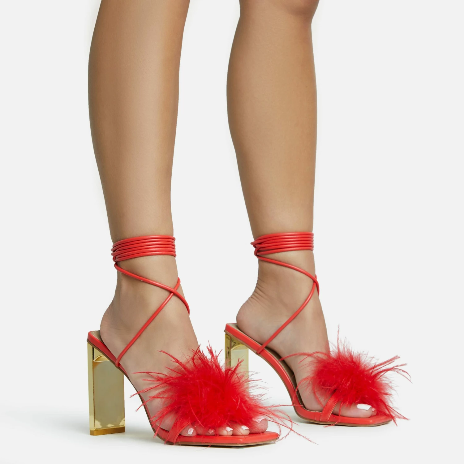 Girl, complete your look with a touch of fierce. Featuring a red faux leather material, with faux feather detailing, a metallic thin block heel, square toe and a lace up finish.