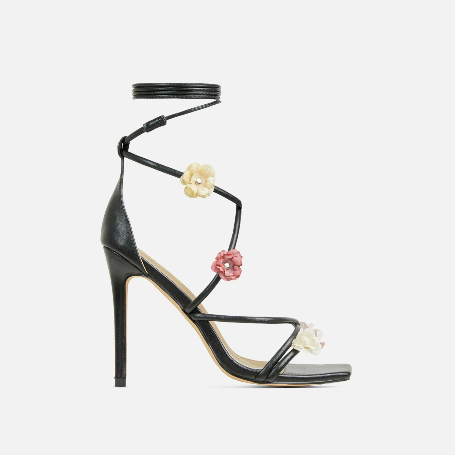 Make a bold entrance with these statement heels doll. Featuring a black faux leather material, with 3D flower strappy detailing, a square toe, stiletto heel and a lace up finish.