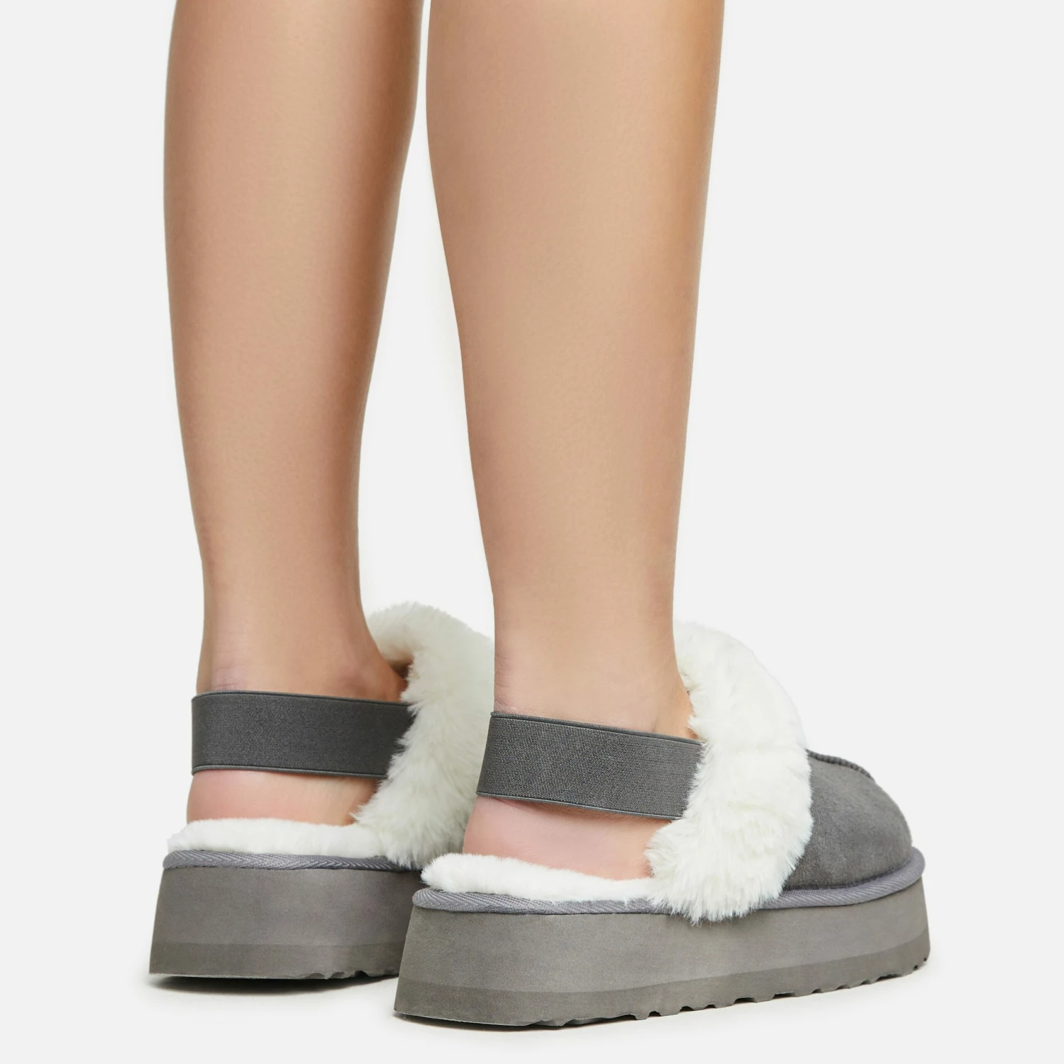 No January blues over here doll. Featuring a grey faux suede material, with faux fur trim detailing, a platform sole and a sling back slipper design.