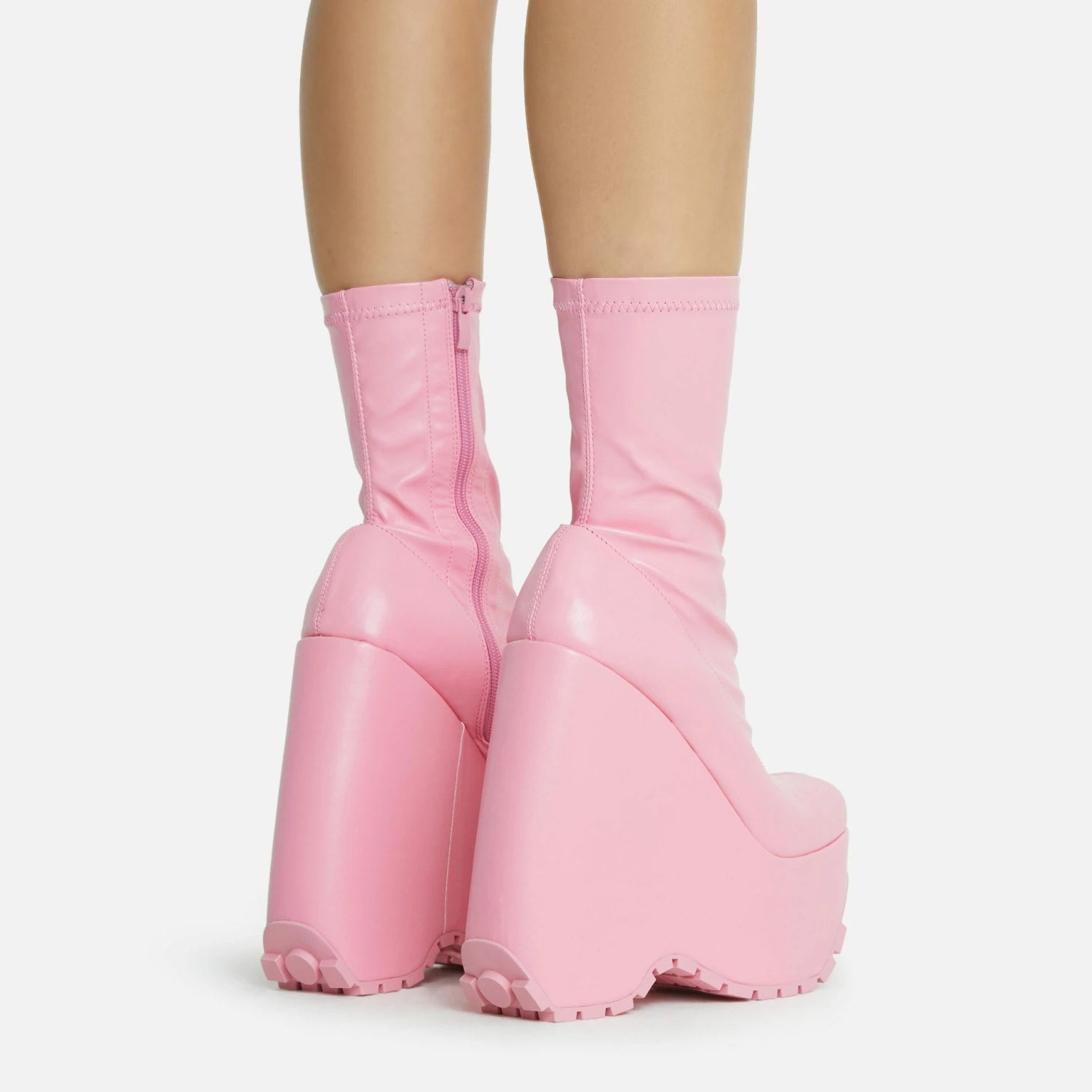Add a pop of colour to your weekend look doll. Featuring a pink faux leather material, with a chunky platform wedge sole and an ankle sock boot design.