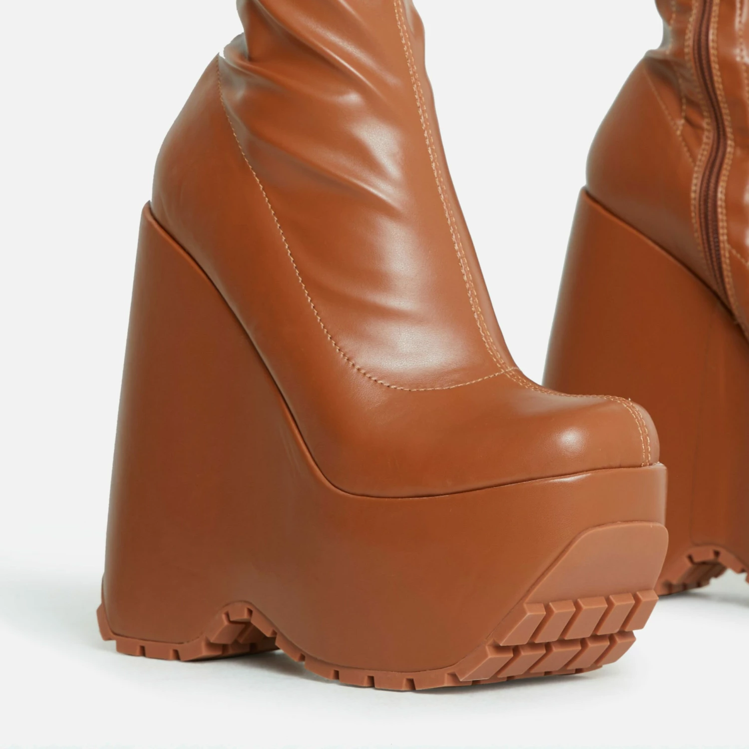 Level up your shoedrobe with these must have boots. Featuring a tan brown faux leather material, with a chunky platform wedge sole and an ankle sock boot design.