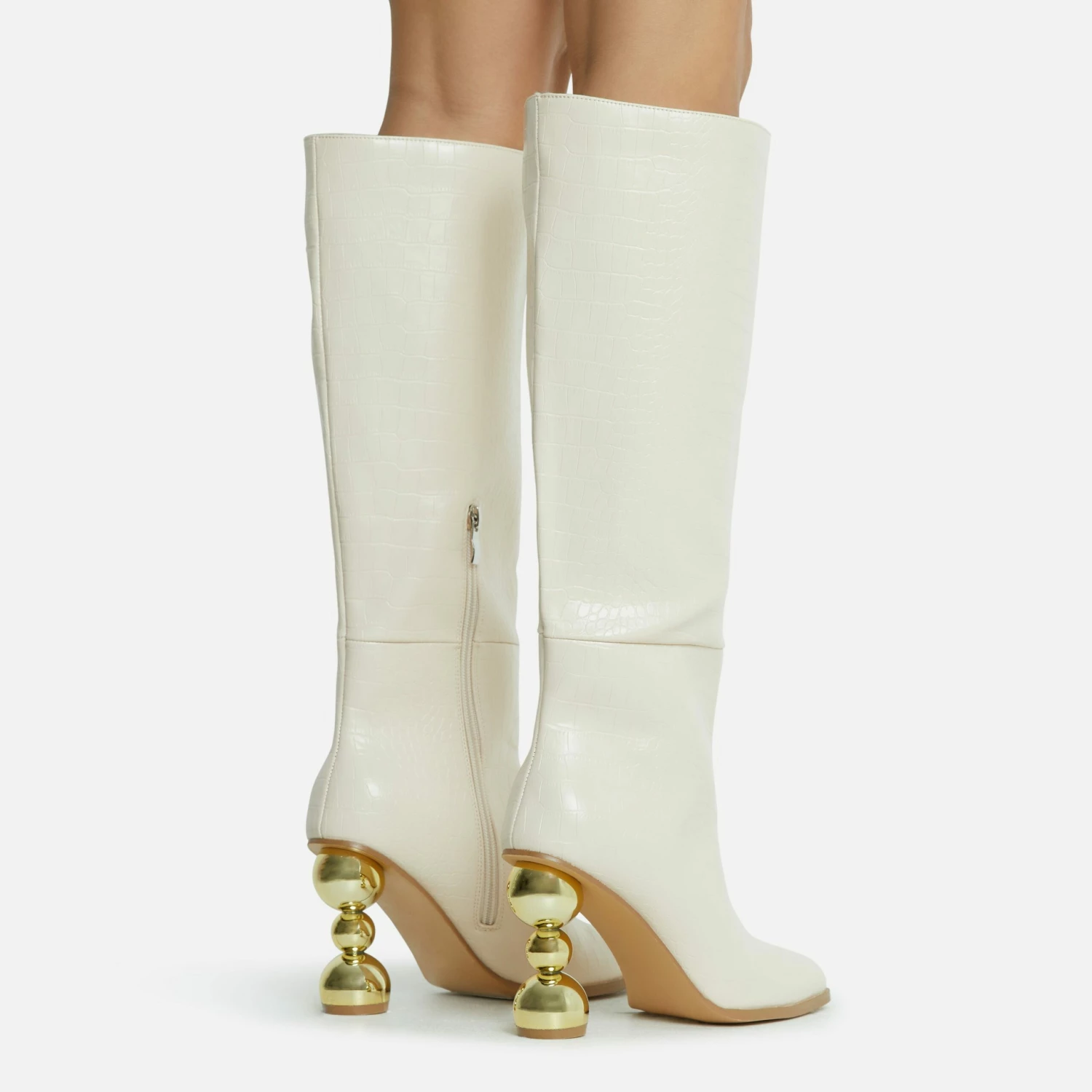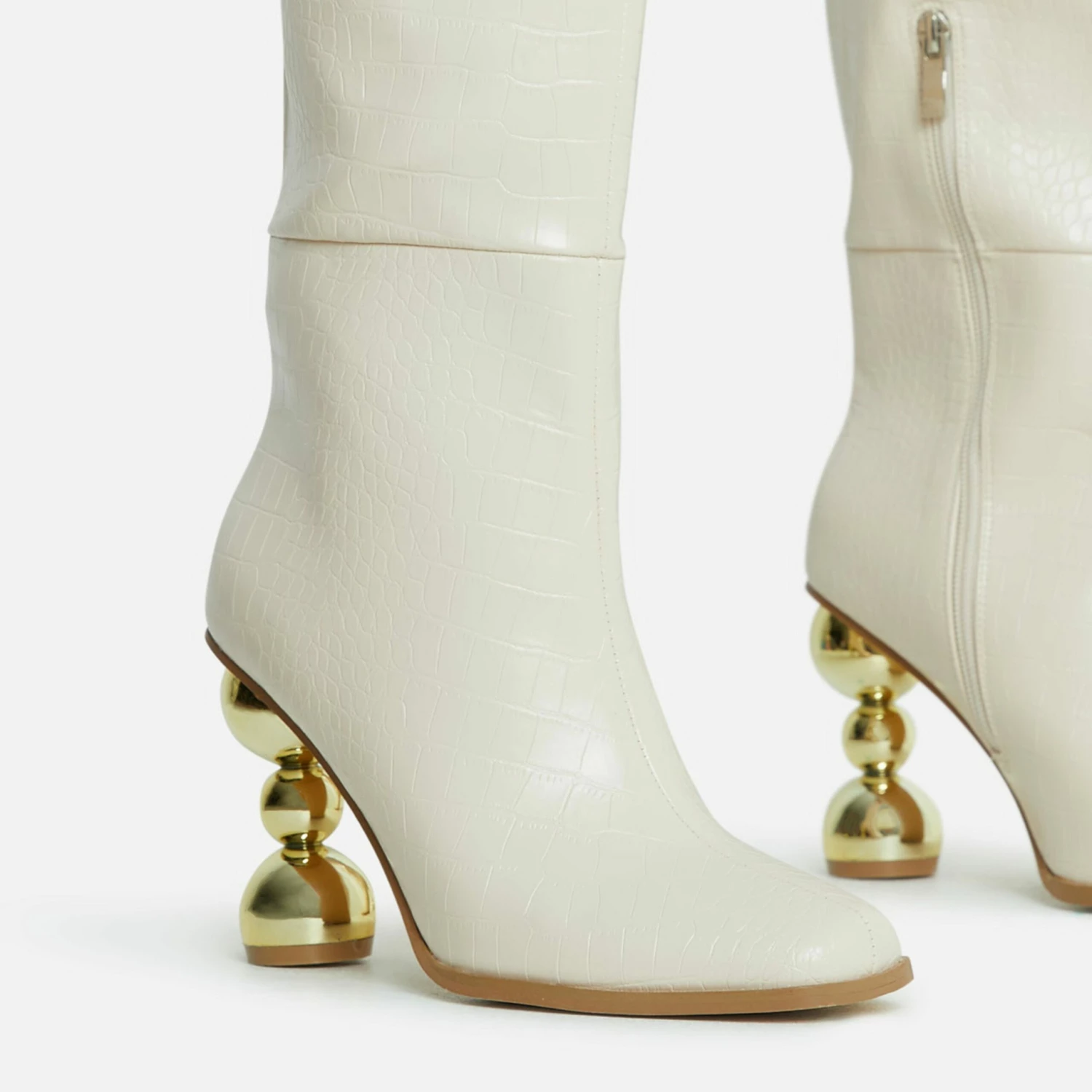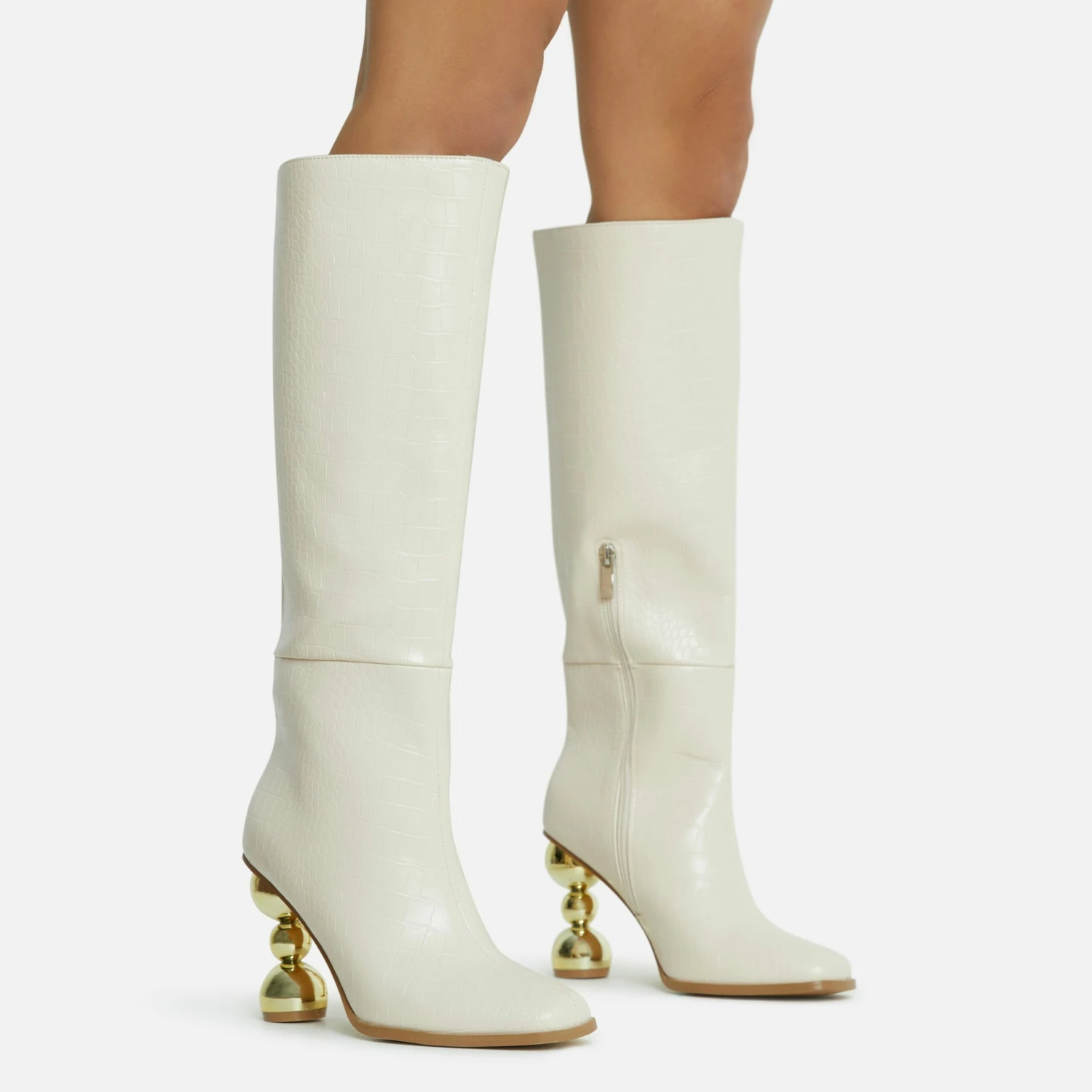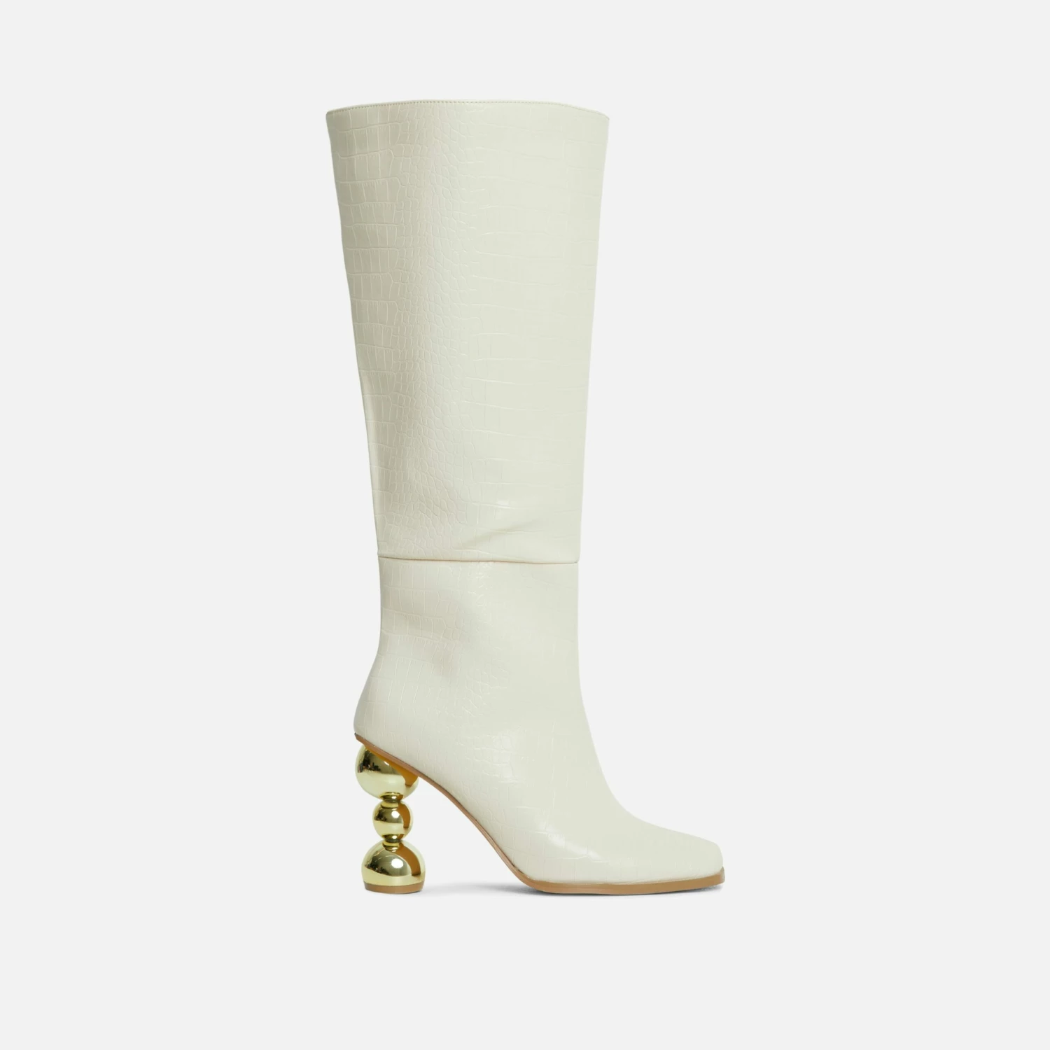 The perfect date night boots just landed and we are obsessed. Featuring a cream croc print faux leather material, with a statement metallic heel, a square toe and a knee high length.