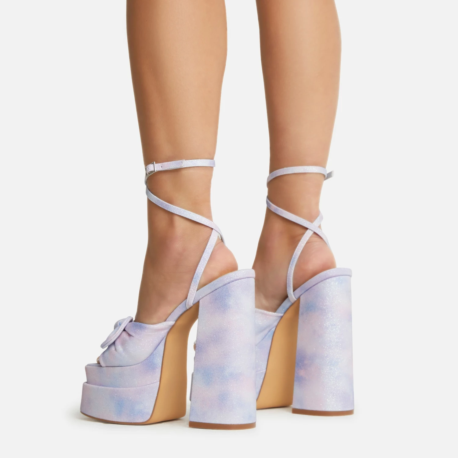 Have all eyes on you in these statement heels doll. Featuring a multi ombre glitter material, with bow detailing, a platform sole, square toe and a block heel.