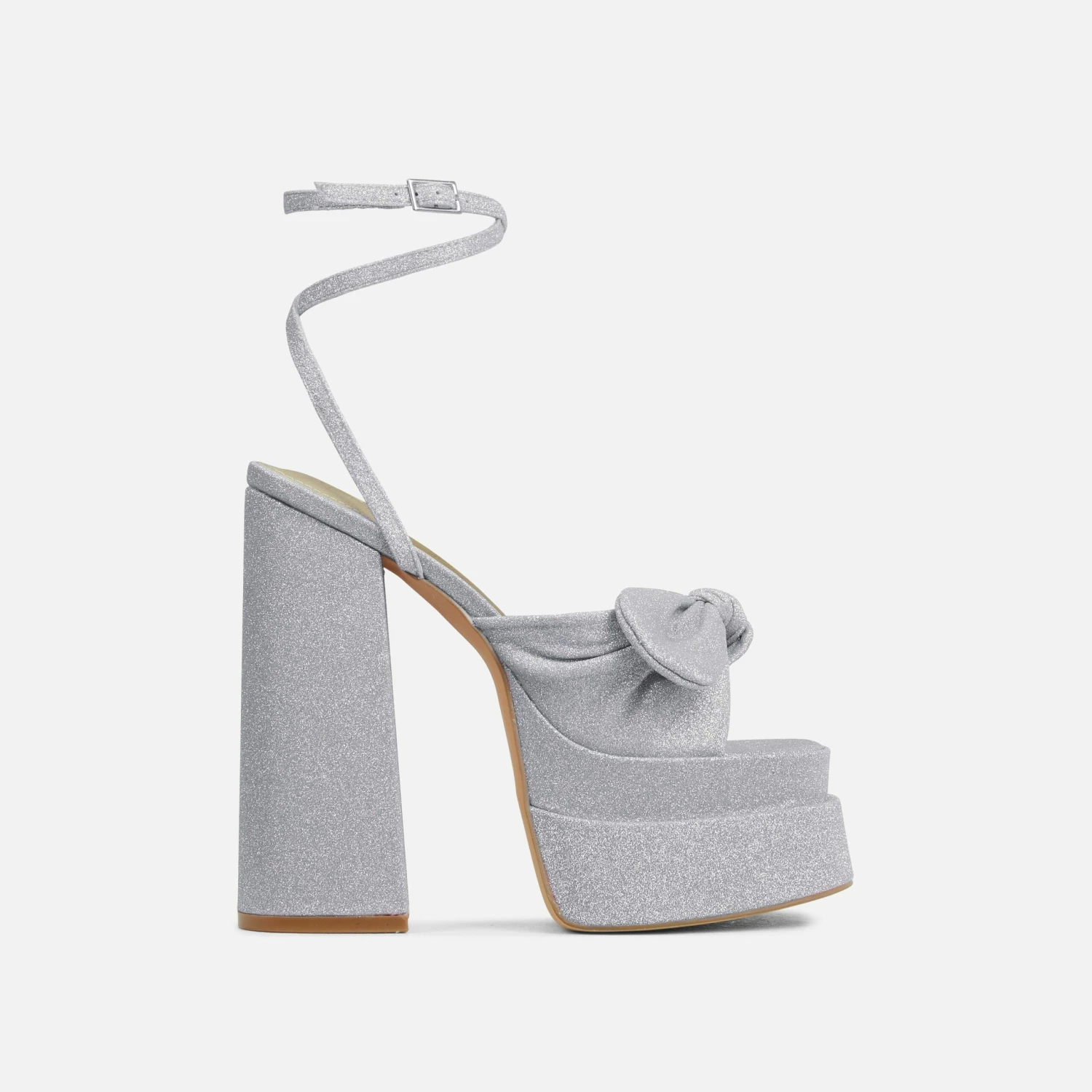 These statement heels are what your wardrobe needs doll. Featuring a silver glitter material, with bow detailing, a platform sole, square toe and a block heel.