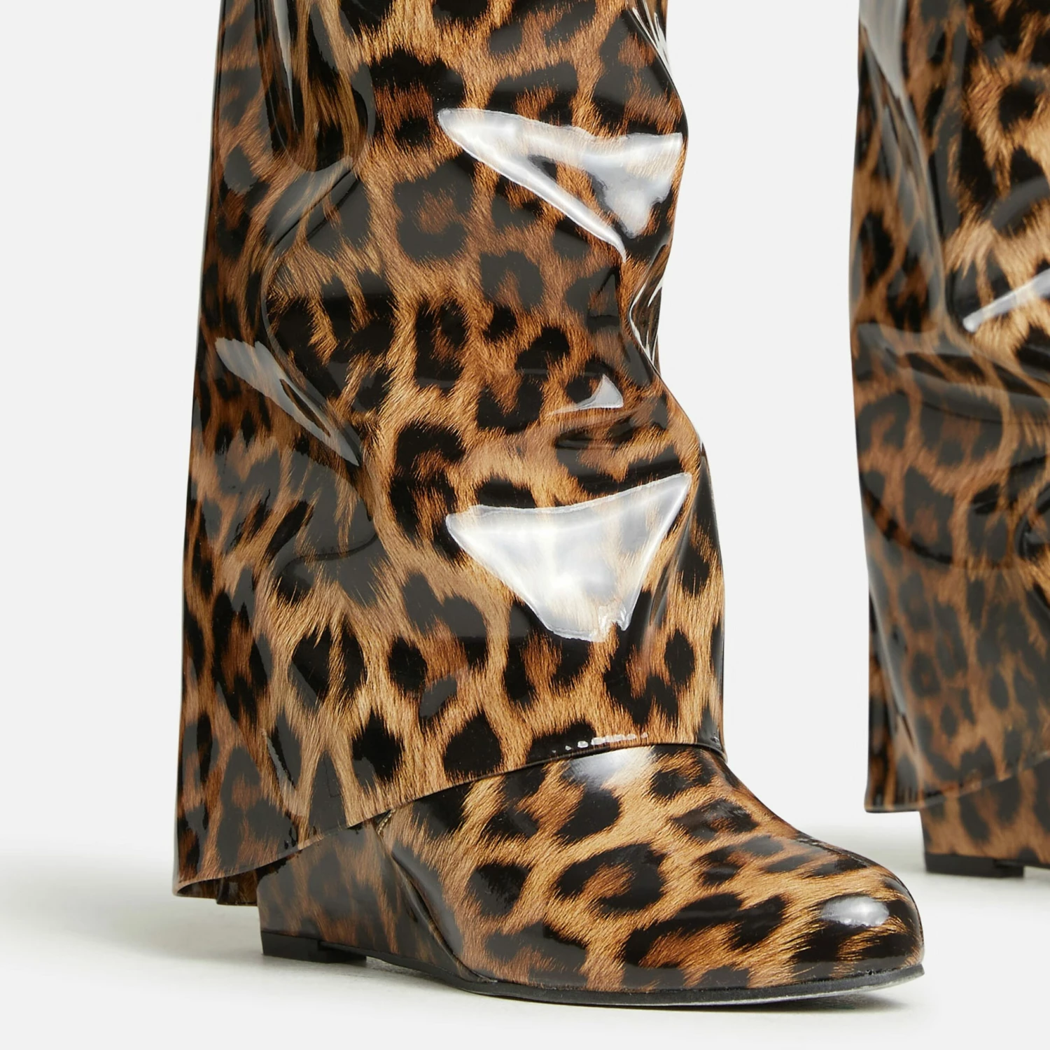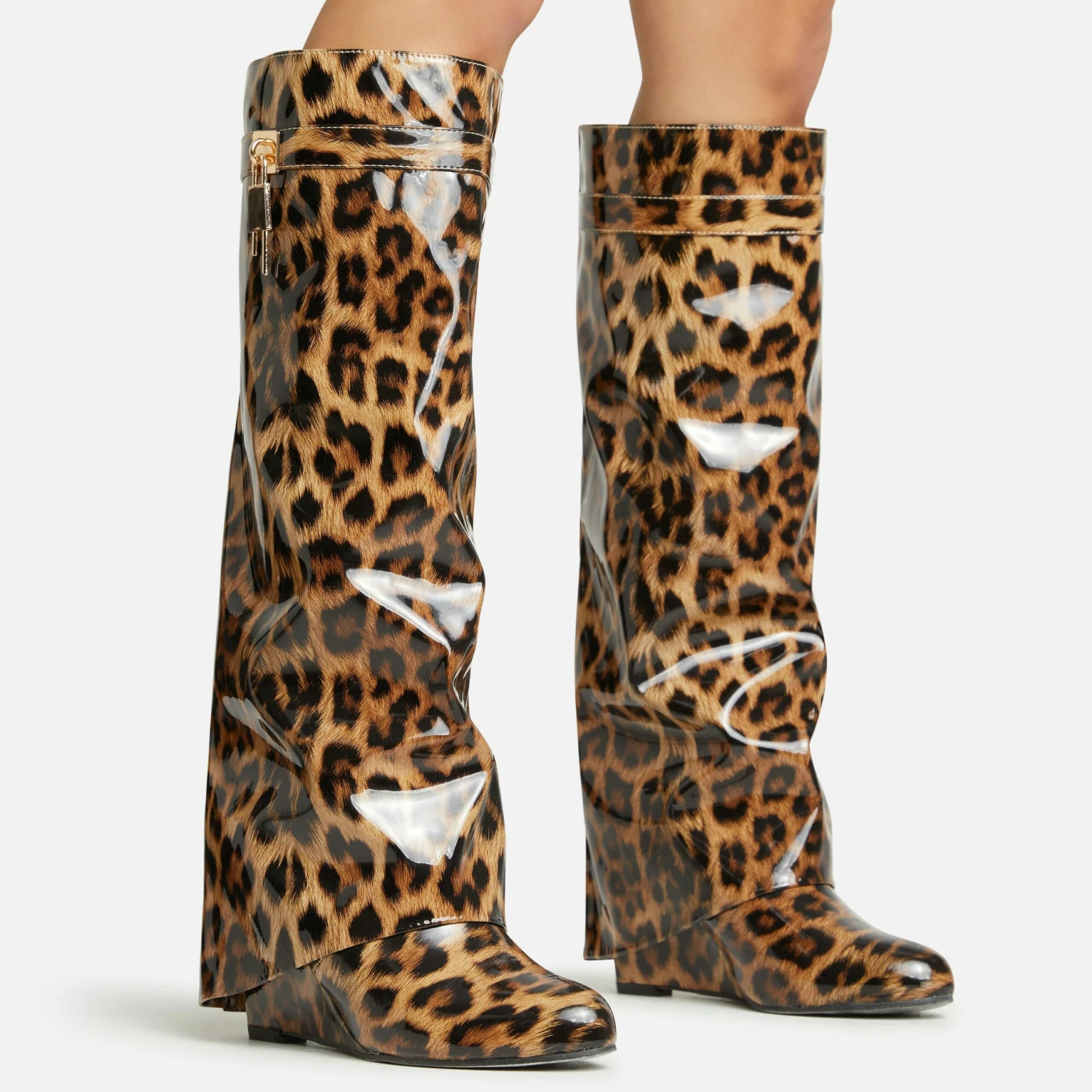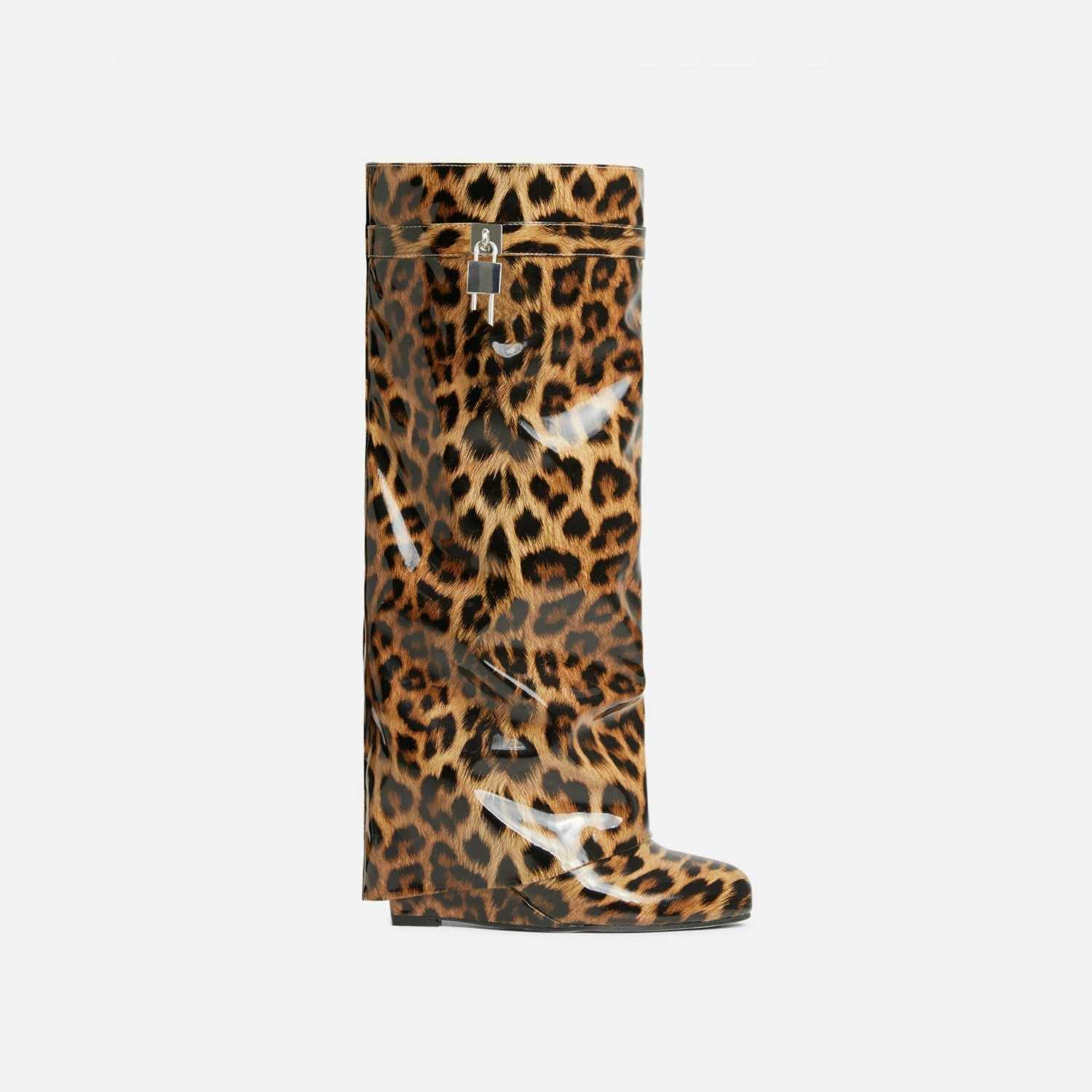 Our best seller just dropped in a new colour way and we’re obsessed. Featuring a leopard print patent material, a padlock detail, a wedge heel and a knee high length.