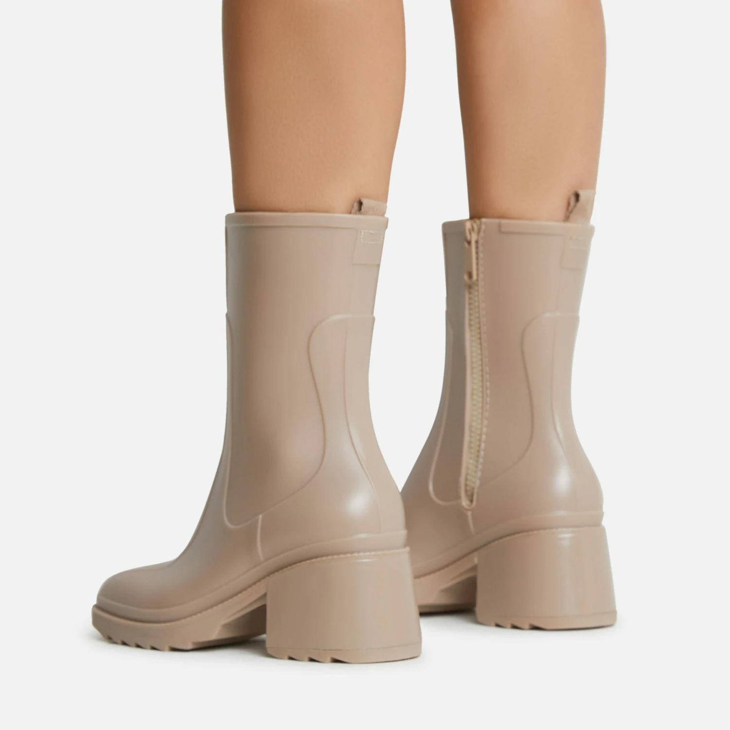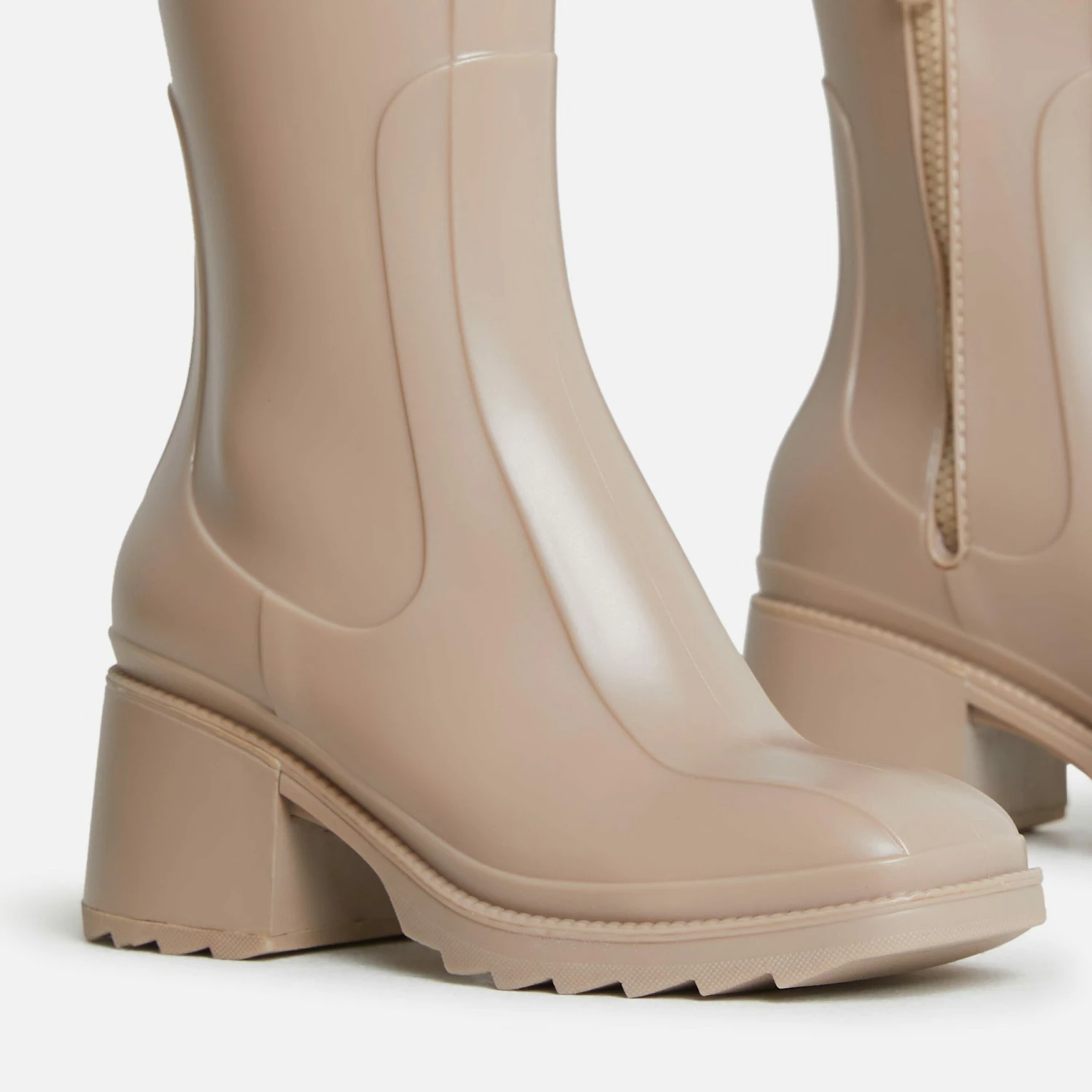 The ultimate boots of dreams have just arrived. Featuring a cream nude rubber material, with a block heel in an ankle boot style.