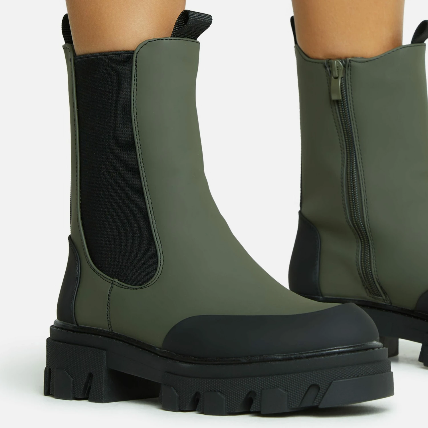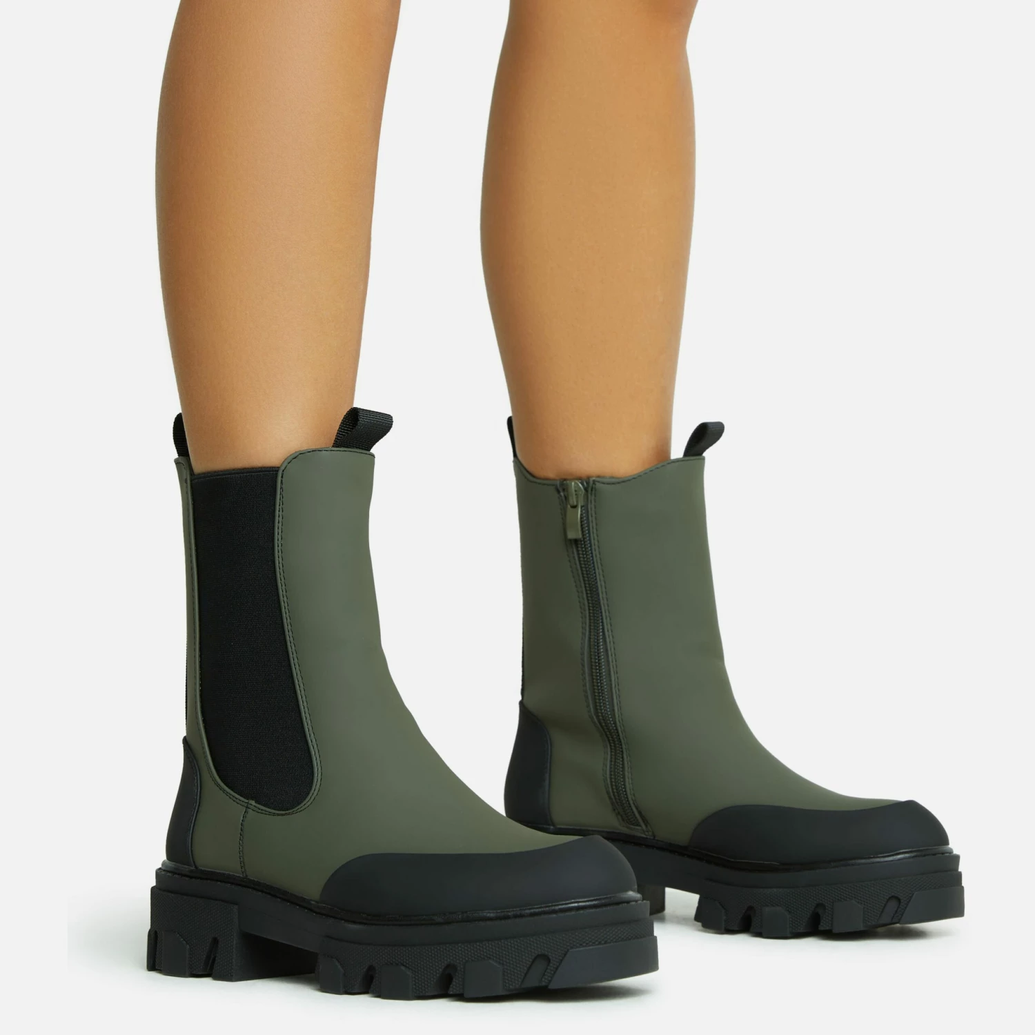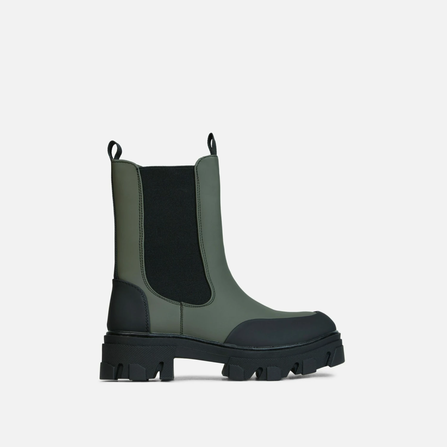 Complete your look with these boots doll. Featuring a green matte rubber material, a rubber toe, a chunky sole and an ankle length, we’re obsessed.