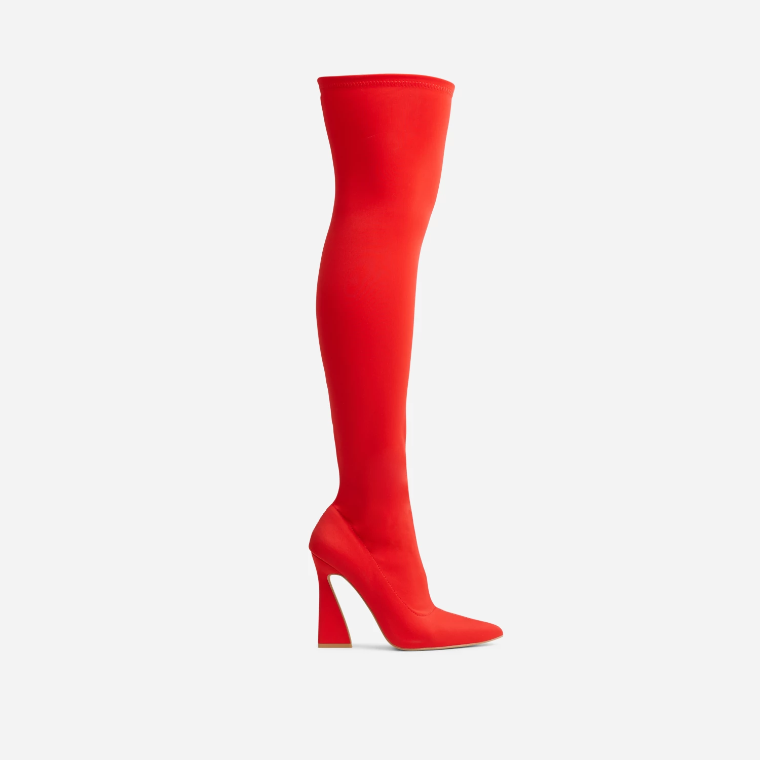Make the crowd stop and stare with these bots doll. Featuring a red lycra material, a knee high length, a block heel and a pointed toe.