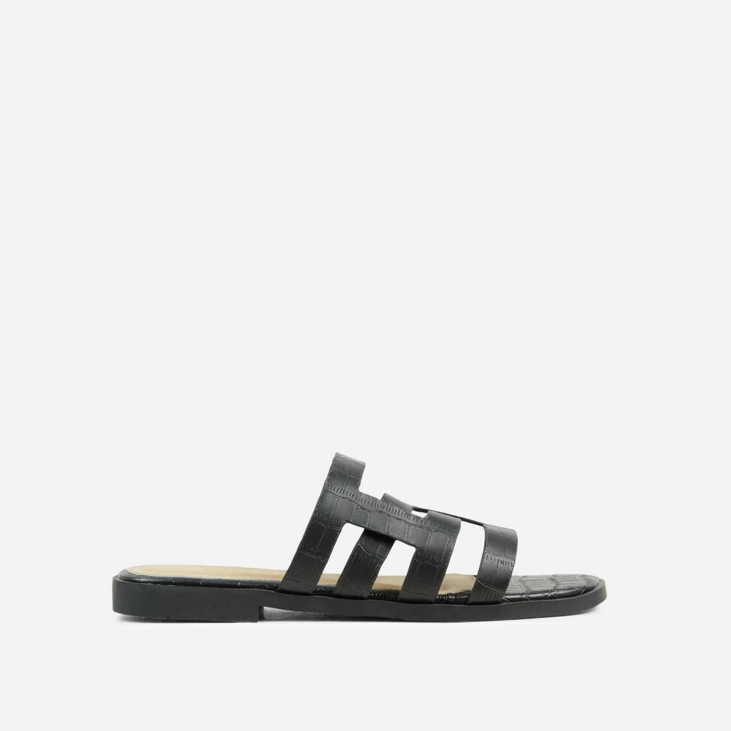 Your everyday look just got a whole better. Featuring a black croc print faux leather material, with caged detailing and a flat slider sandal design.