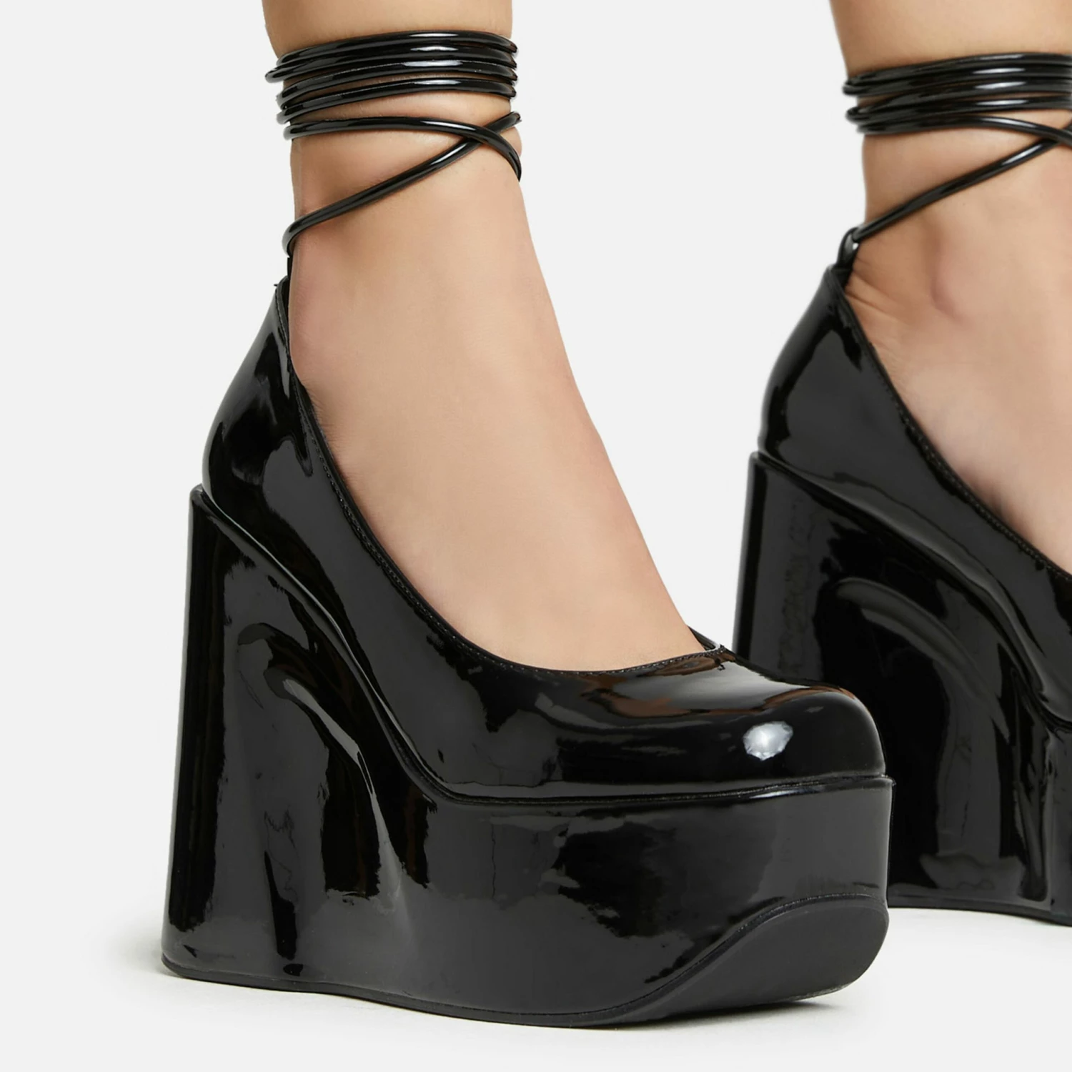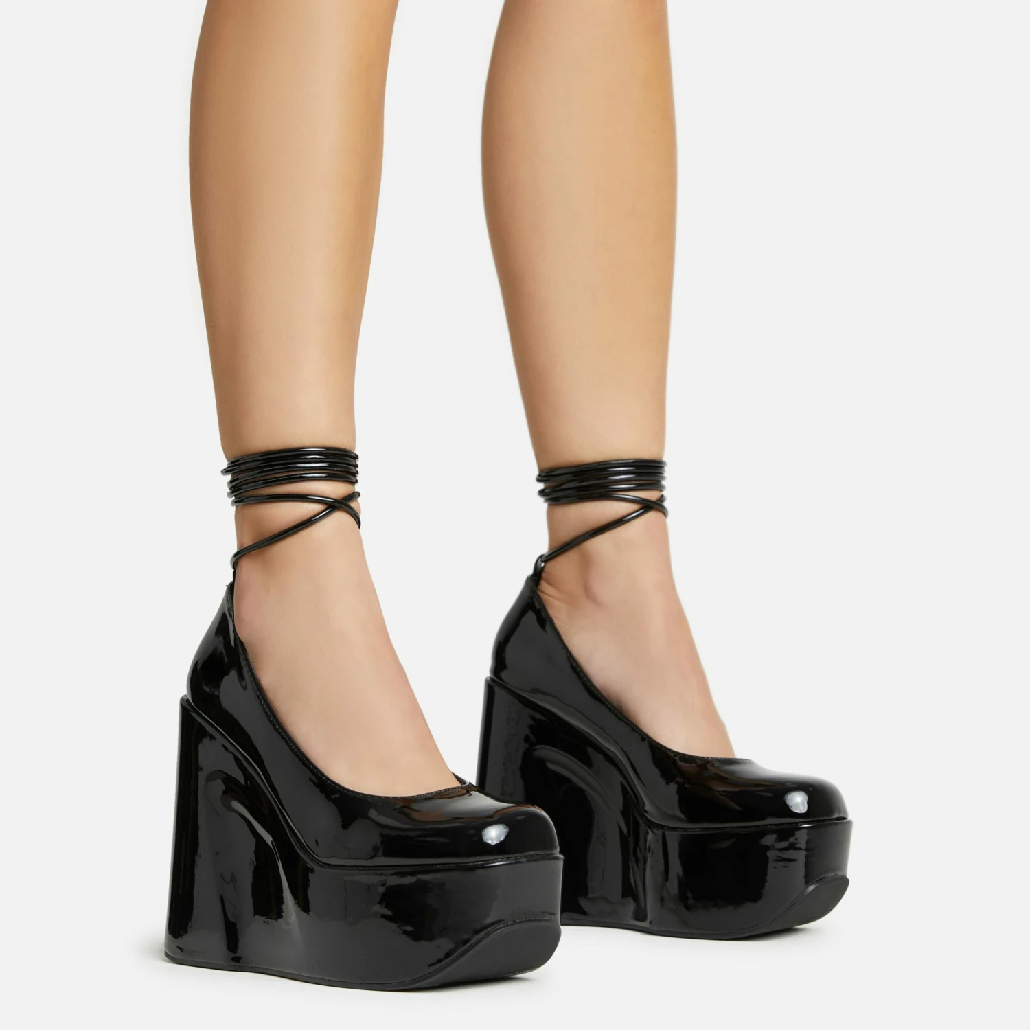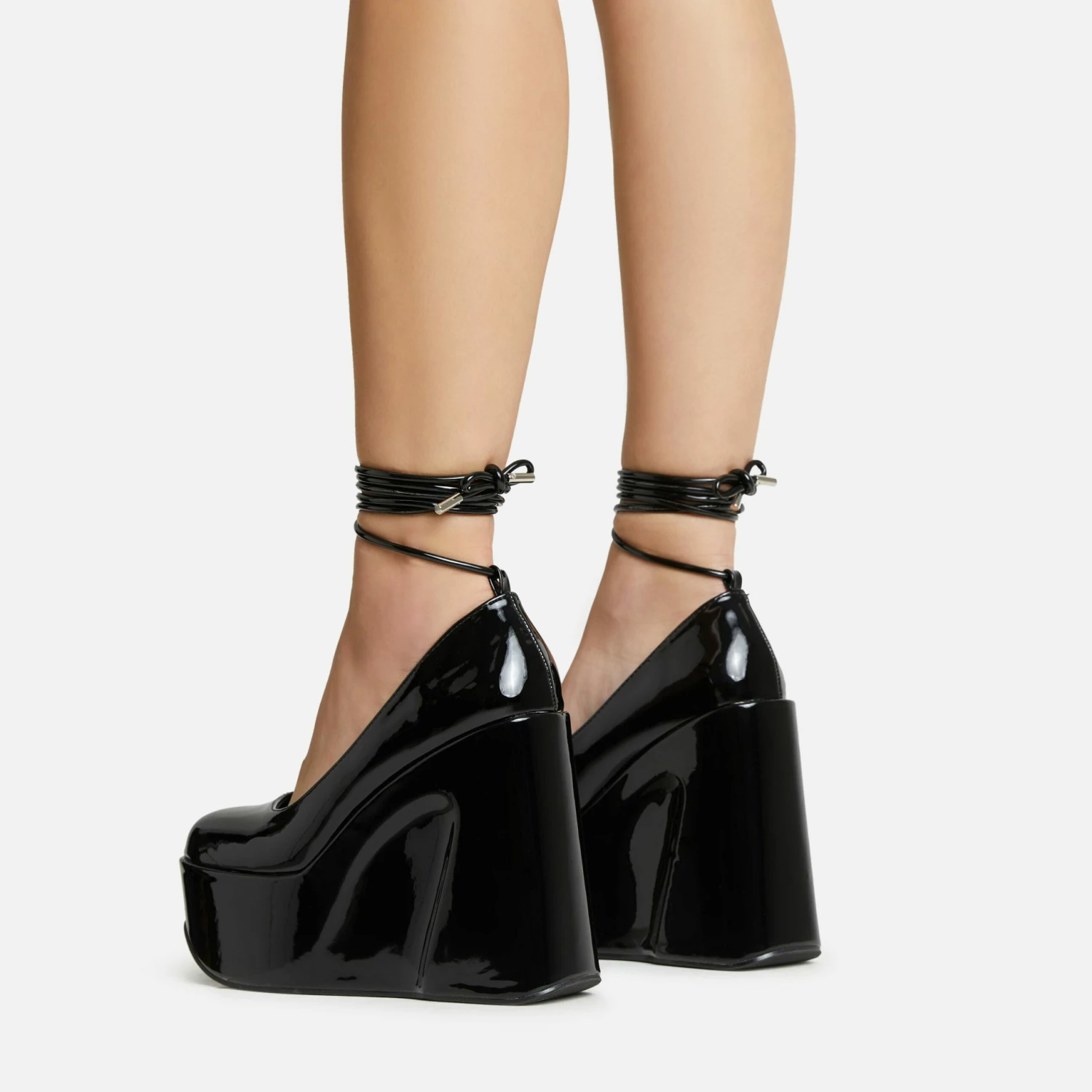 These wedge heels are made for walking doll. Featuring a black patent material, a lace-up design, a closed square toe and a platform wedge.