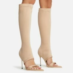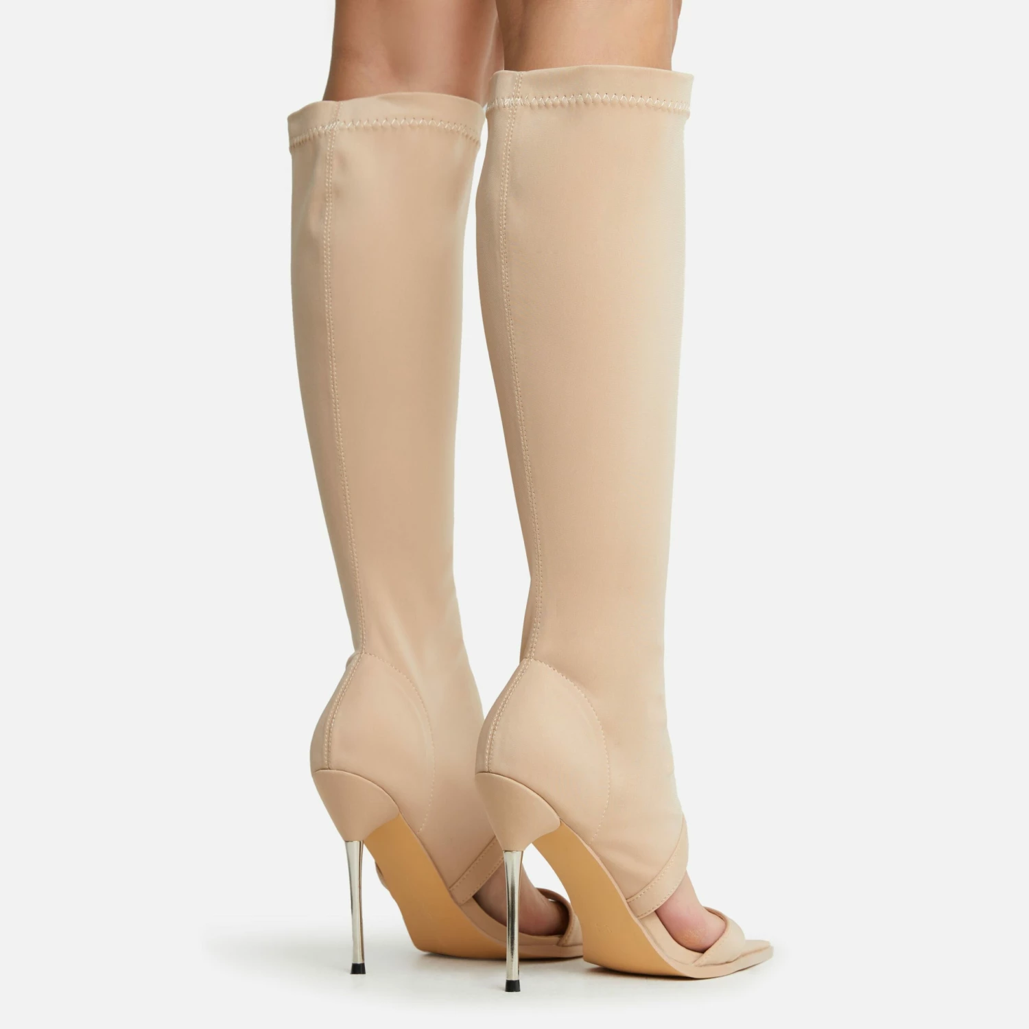Update your brunch date look with with these dreamy neutral hues. Featuring a nude lycra material, with a pointed toe, a metallic stiletto heel and a knee high length.