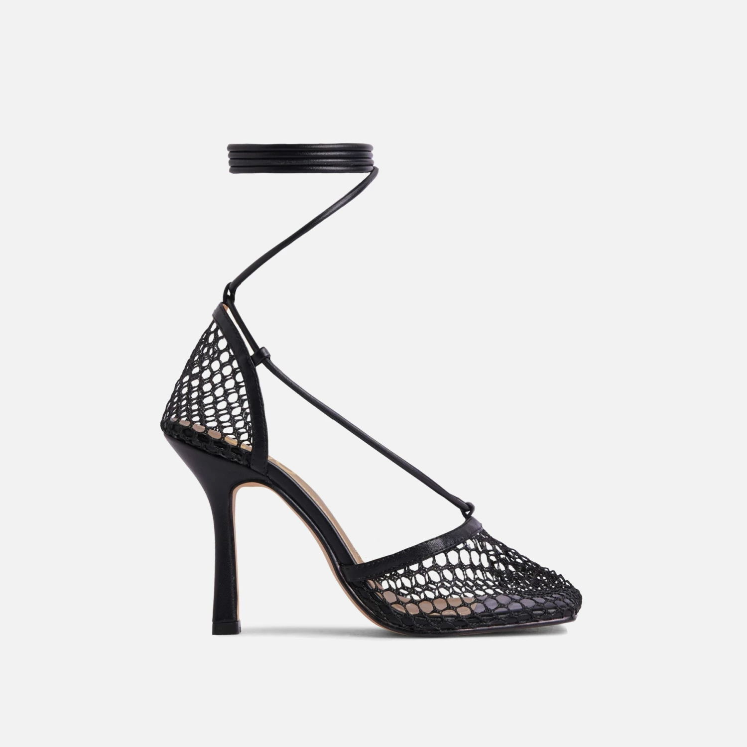 Get fresh off the runway styles with our New-Me lace up fishnet heels in black. Team these with a blazer dress and turn full CEO.