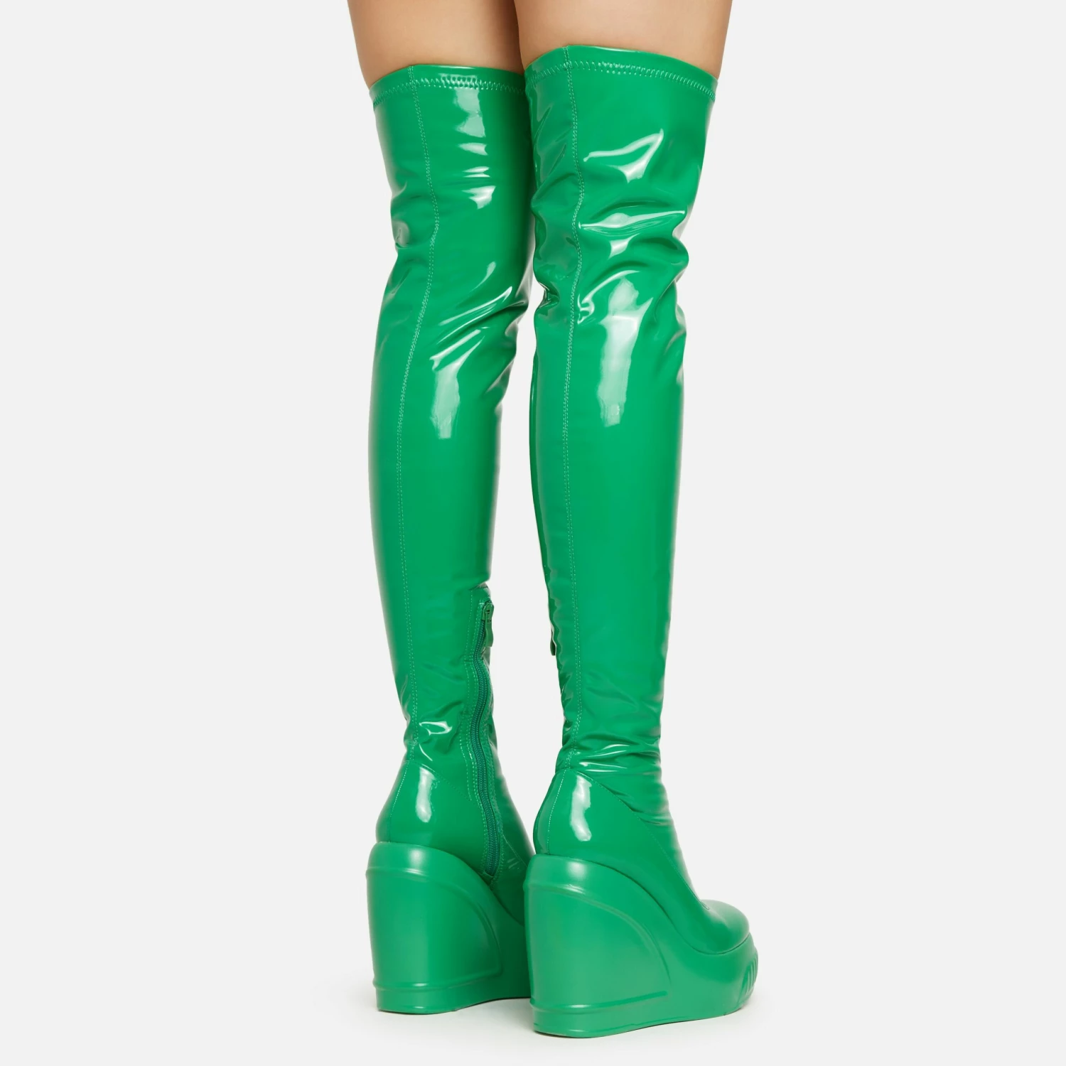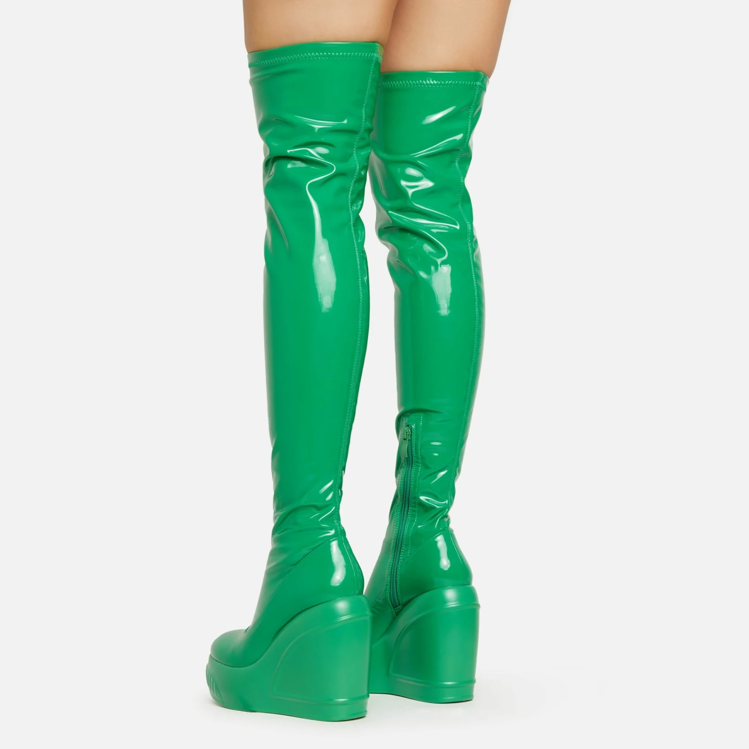 Stay on trend this season with these must have boots. Featuring a green patent material, a platform wedge and an over the knee length.
